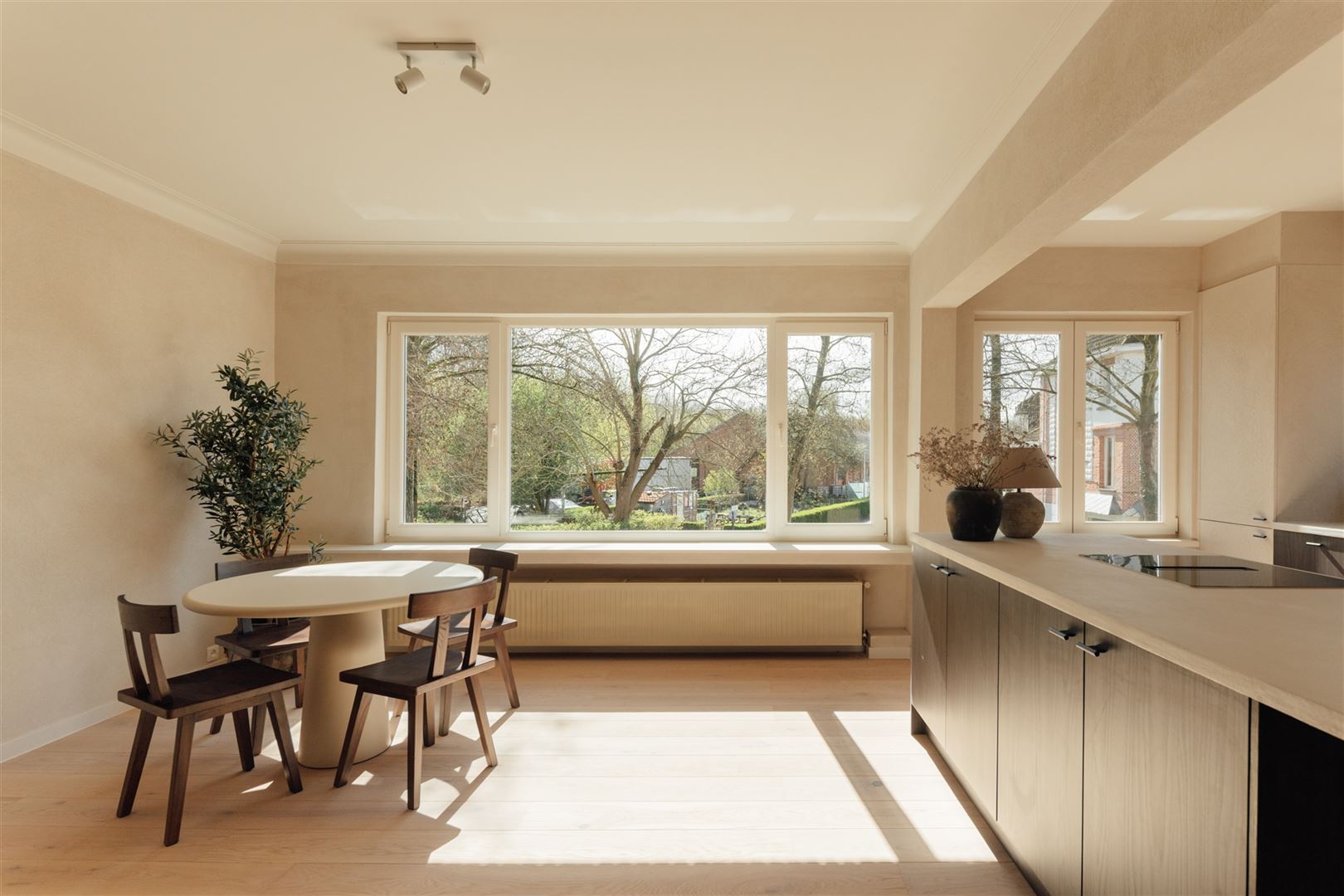 De combinatie van warme parketvloeren, maatwerk houtaccenten en subtiele schildertechnieken creëert een rustgevende en luxueuze woonbeleving die je zelden tegenkomt.