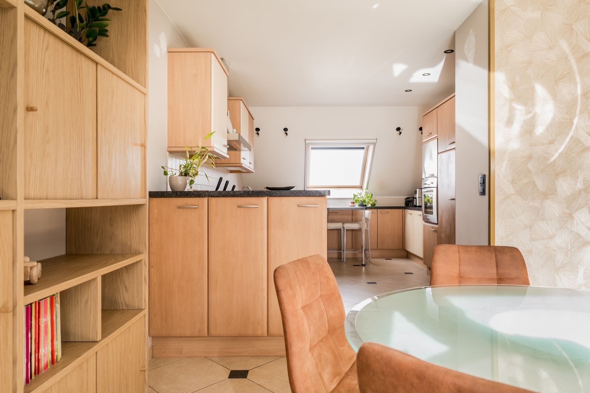 De volledig uitgeruste keuken beschikt over een inductiekookplaat, dampkap, vaatwasser, microgolfoven, oven en koelkast, en biedt alle comfort voor wie graag kookt.
