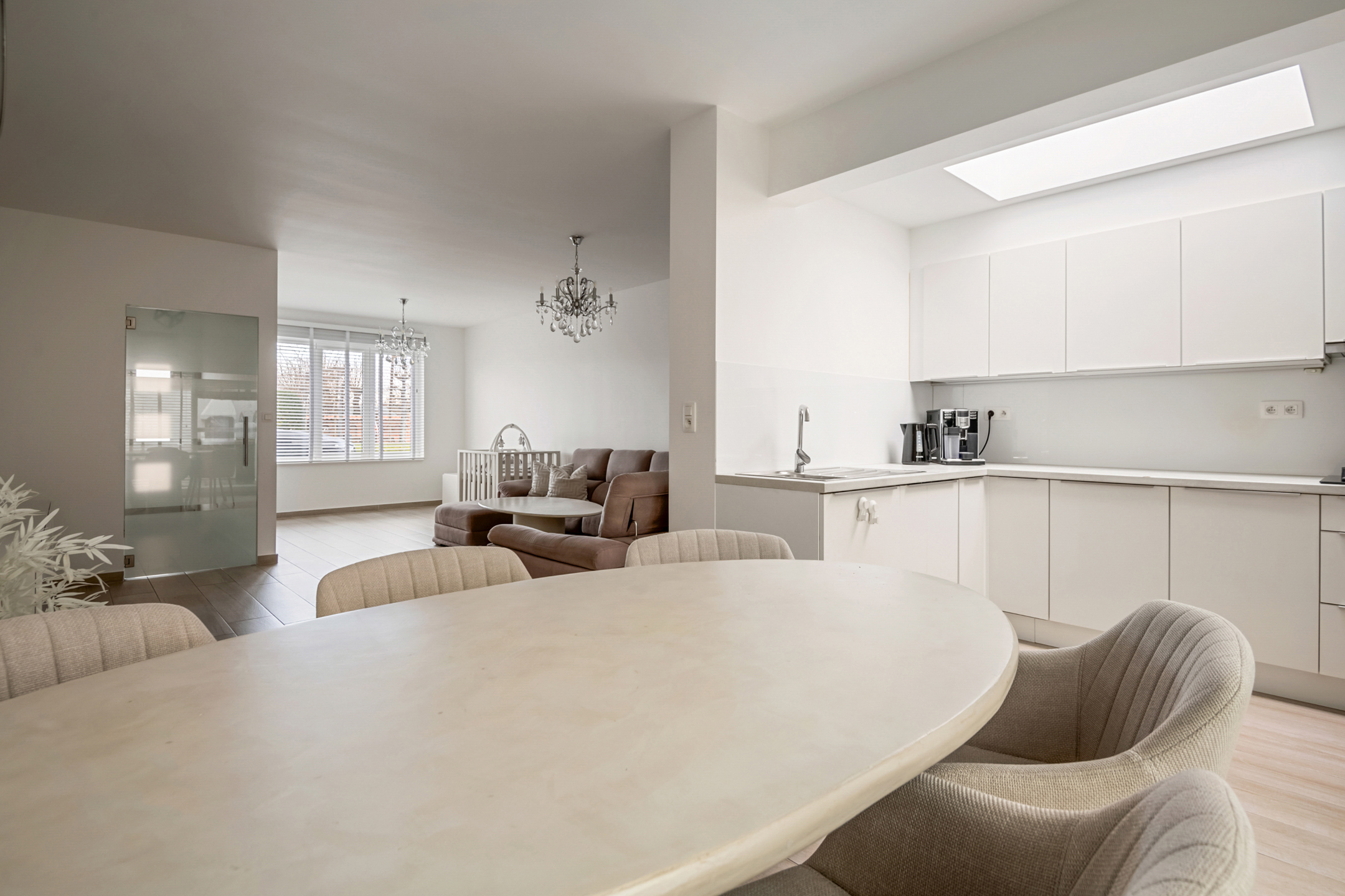 De inkomhal en leefruimte zijn van elkaar gescheiden door een elegante glazen deur, wat zorgt voor een open maar toch afgebakend gevoel. Grote raampartijen met schuiframen creëren een aangename verbinding met buiten en laten overvloedig daglicht binnen.