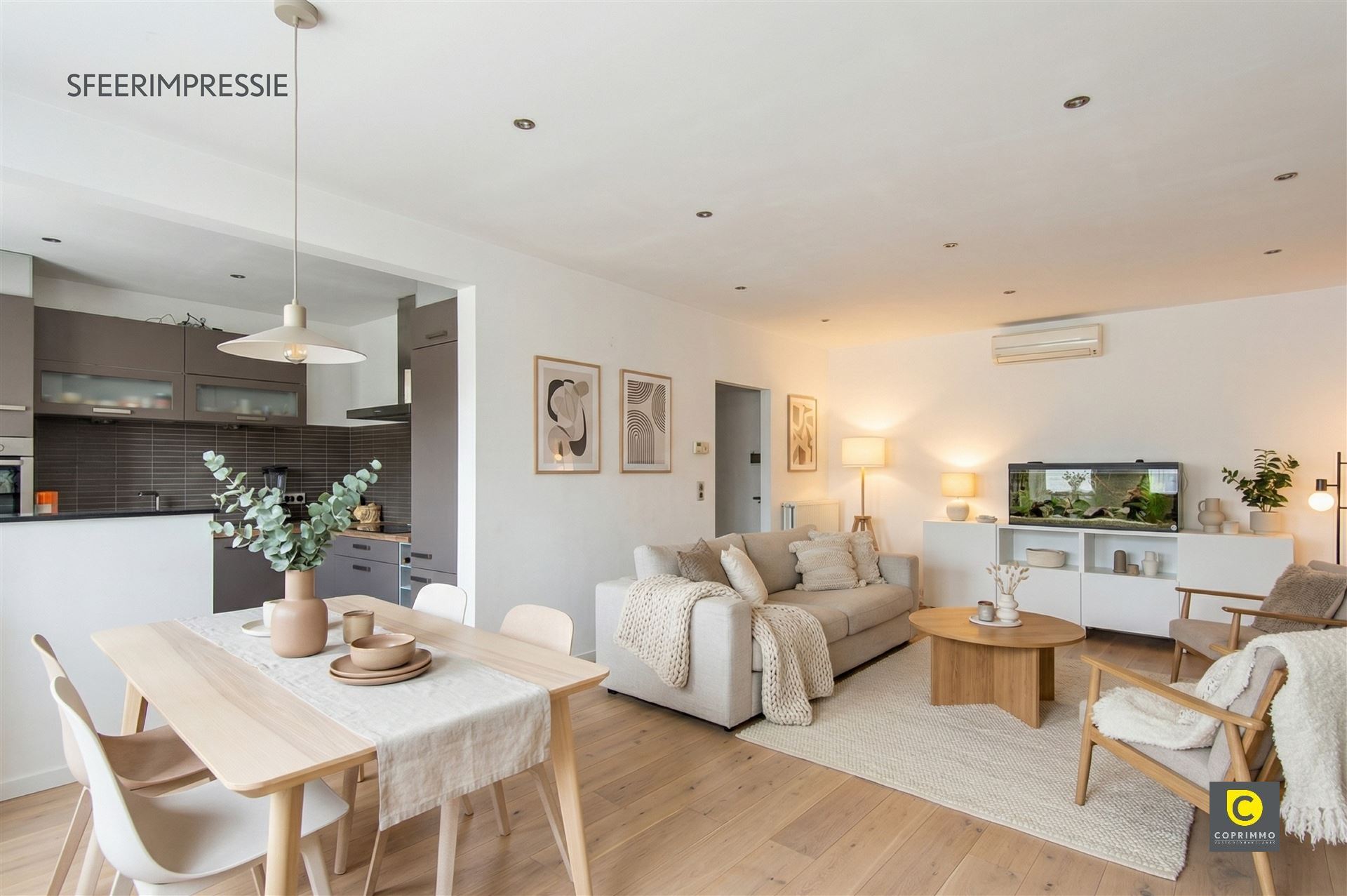 U betreedt het appartement via de inkomhal, voorzien van een veiligheidsdeur en parlofoon. De ruime leefruimte geniet van veel natuurlijke lichtinval en is volledig uitgerust met airconditioning. De open keuken is voorzien van alle moderne toestellen, waaronder een keramische kookplaat, dampkap, oven, microgolf, koelkast en diepvriezer, en beschikt over voldoende kastruimte. Zowel de leefruimte als de keuken zijn afgewerkt met een moderne, onderhoudsvriendelijke tegelvloer.