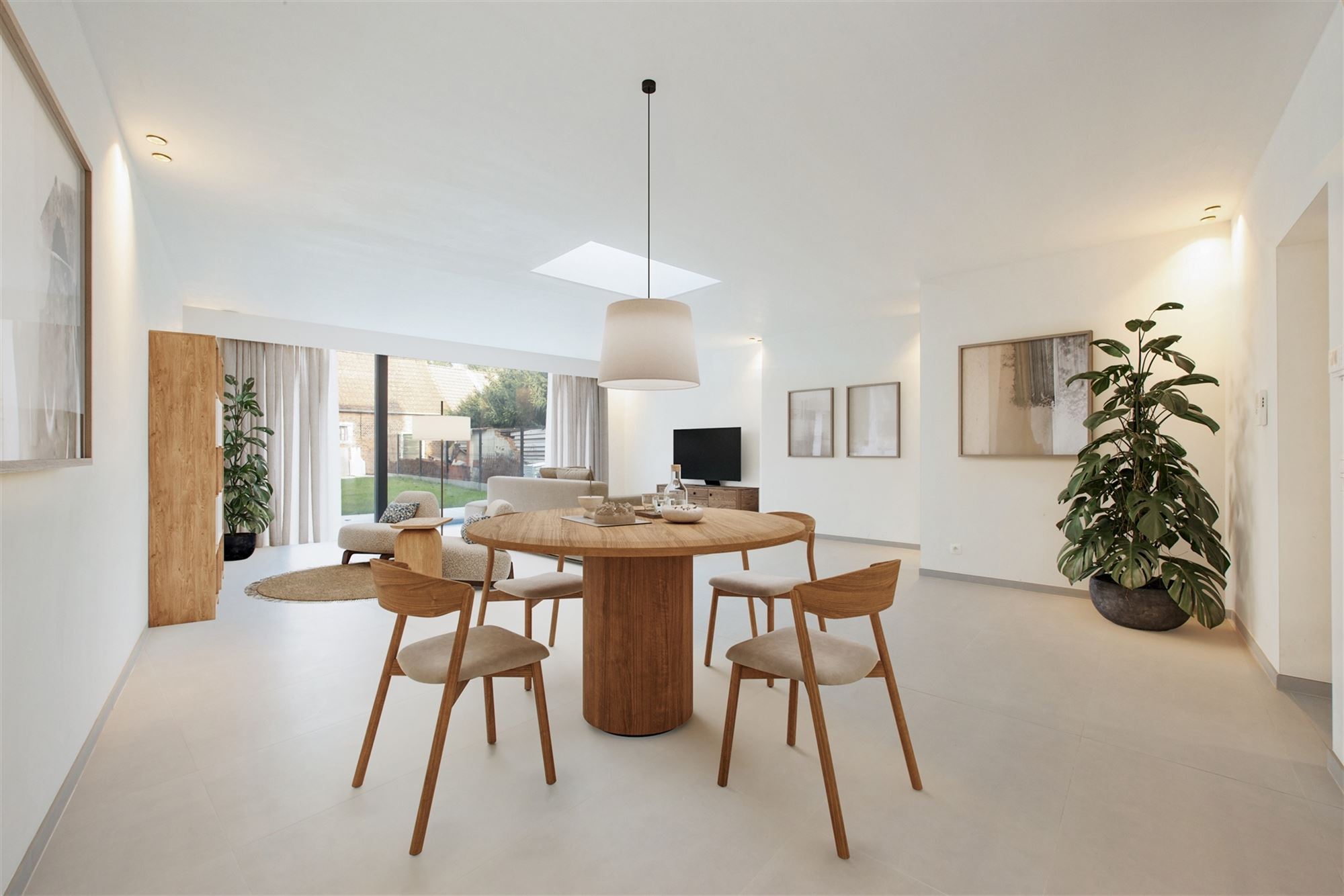 Deze brede woning met epc B (117 kWh/m²/jaar) ligt op wandelafstand van een school en de schilderachtige Scheldeboorden. De zwarte alu en pvc-ramen contrasteren mooi met de witte sierpleister en de arduinen plint. Ook het interieur verrast, dankzij grote rechthoekige tegels, opdekdeuren, hoge plafonds, 3 stalen deuren met glas, speciale plafondspots, videofoon, etc. De vernieuwde woning omvat een warmtepomp (Viessmann Vitocal 111), ventilatiesysteem D, 18cm dakisolatie (schuin dak) en 10cm gevelisolatie. In de grote leefruimte zorgt een veluxkoepel met driedubbel glas voor extra licht. Het brede schuifraam kijkt uit op een omheinde tuin (groen uitzicht) en een betegeld terras. In de luxekeuken met wit composietwerkblad en eiland, zijn zwarte en witte kastdelen verwerkt. Ons oog valt op een designdampkap, gasvuur, koelkast, oven, vaatwasser en microgolfoven. Qua bergruimte hebt u vanuit de keuken toegang tot de kelder en een extra berging onder de zwarte metalen designtrap met houten treden. Aanpalend aan de garage is een wasplaats voorzien. De grote badkamer (1e verdieping) bedient de zeer grote master bedroom (parket) met hoog plafond en een tweede kamer van meer dan 6 meter lengte. Er is plaats voor: hangtoilet, zwarte sierradiator, dubbel meubel en inloopdouche. Op de 2e verdieping, waar ook een technische berging aanwezig is, geniet de grote kamer van een eigen en suite badkamer met lavabomeubel, hangtoilet, sierradiator en inloopdouche met glazen wand.