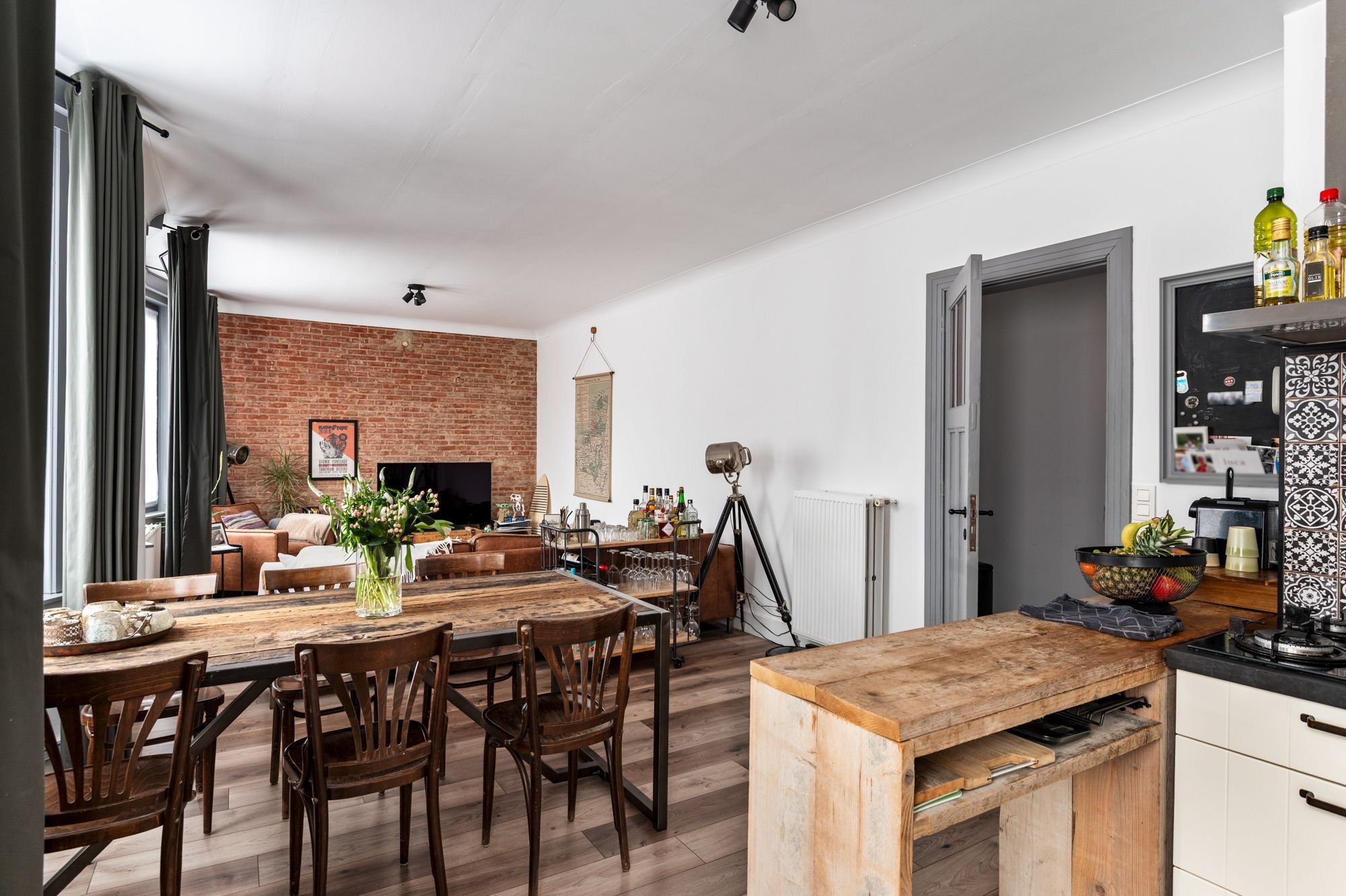 Het appartement werd enkele jaren geleden smaakvol gerenoveerd: keuken, badkamer, vloeren, ramen en terras zijn vernieuwd. Je hoeft er enkel je meubels in te zetten en te genieten. Bij het binnenkomen stap je in een aangename inkomhal met ruimte voor vestiaire, die je meteen leidt naar de absolute troef van het appartement: een uitzonderlijk ruime en lichtrijke leefruimte van bijna 9,5 meter lang. De volledig uitgeruste keuken sluit hier naadloos op aan en beschikt over een gasvuur, combi-oven, ingebouwde koelkast en diepvries, én een vaatwasser.