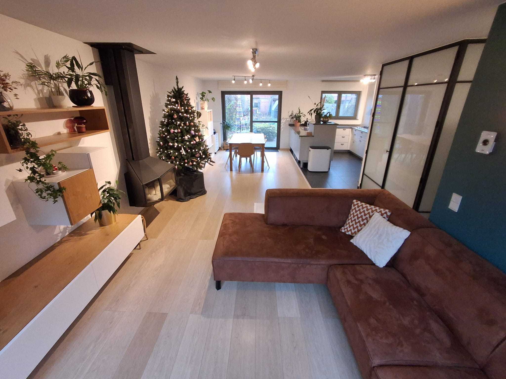 •open, lichtrijke leefruimte met woonkamer (met vaste kastenwand en design haard), eetkamer en volledig ingerichte keuken (vaatwasmachine nieuw aangekocht in 2025).