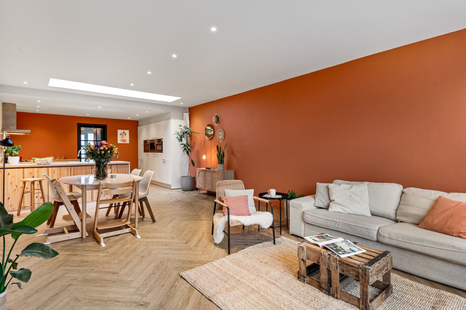 Bij het betreden van de woning wordt u meteen verwelkomd door de charmante inkomhal, voorzien van een gastentoilet en vestiaire. Van hieruit bereikt u de ruime en lichtrijke leefruimte, waar een lichtstraat en grote raampartijen zorgen voor veel natuurlijke lichtinval en een prachtig zicht op de tuin.