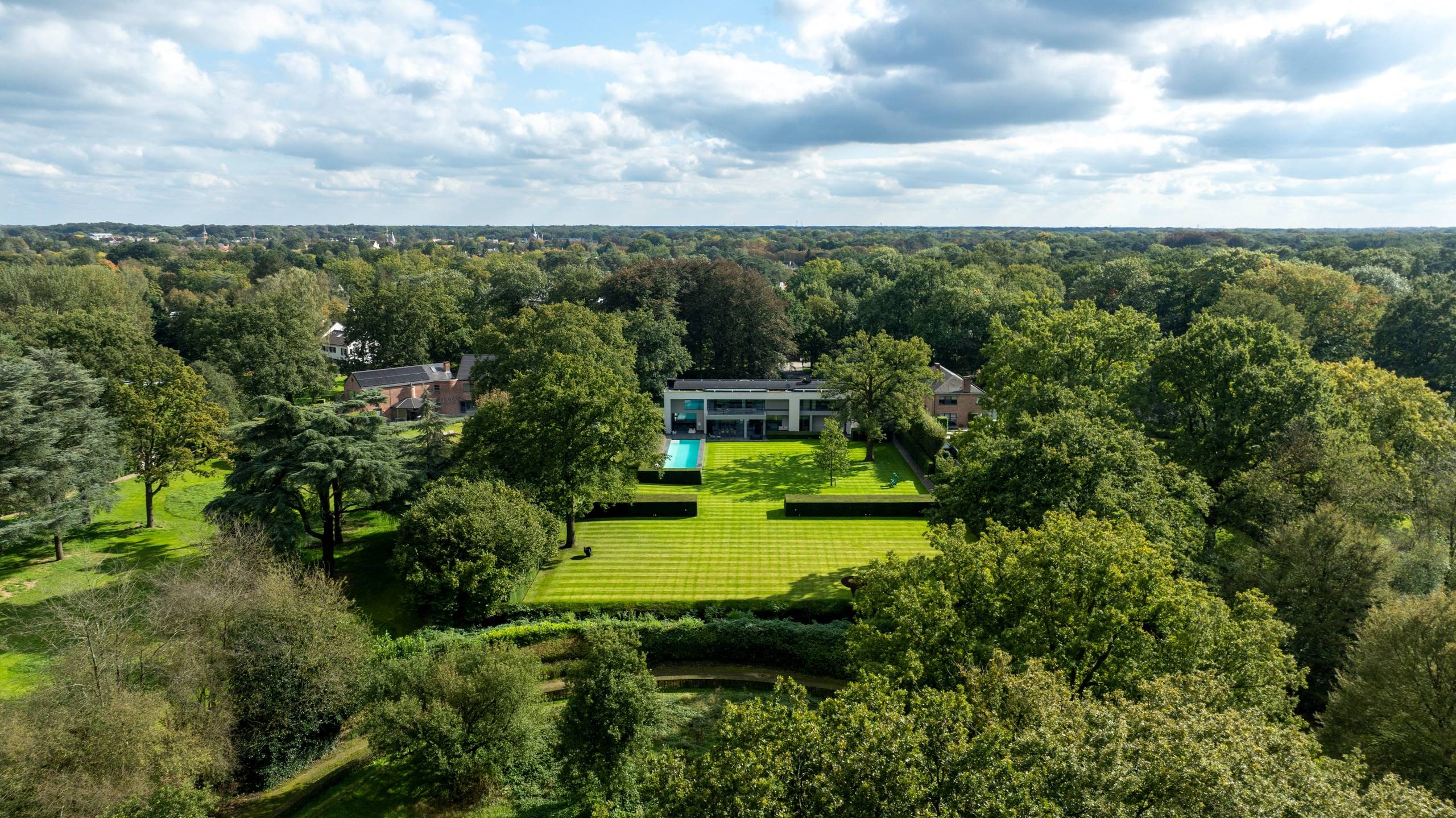 We rijden de magnifieke laan in, richting deze unieke moderne villa onder architectuur naar een ontwerp van Vlassak Verhulst.