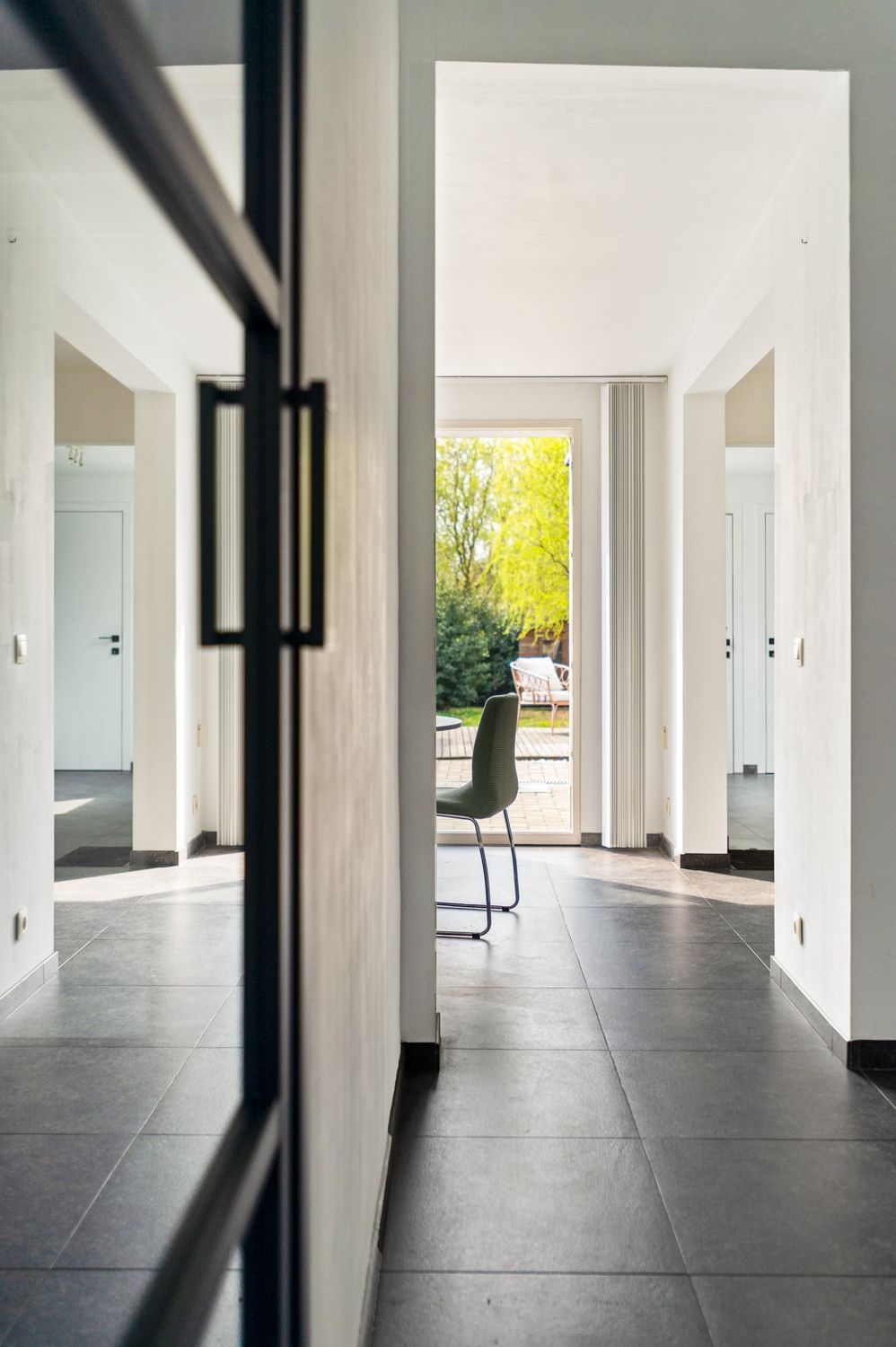 De royale inkomhal verwelkomt je in in je nieuwe thuis met verrassend veel ruimte en licht, mede dankzij de hoge plafonds.