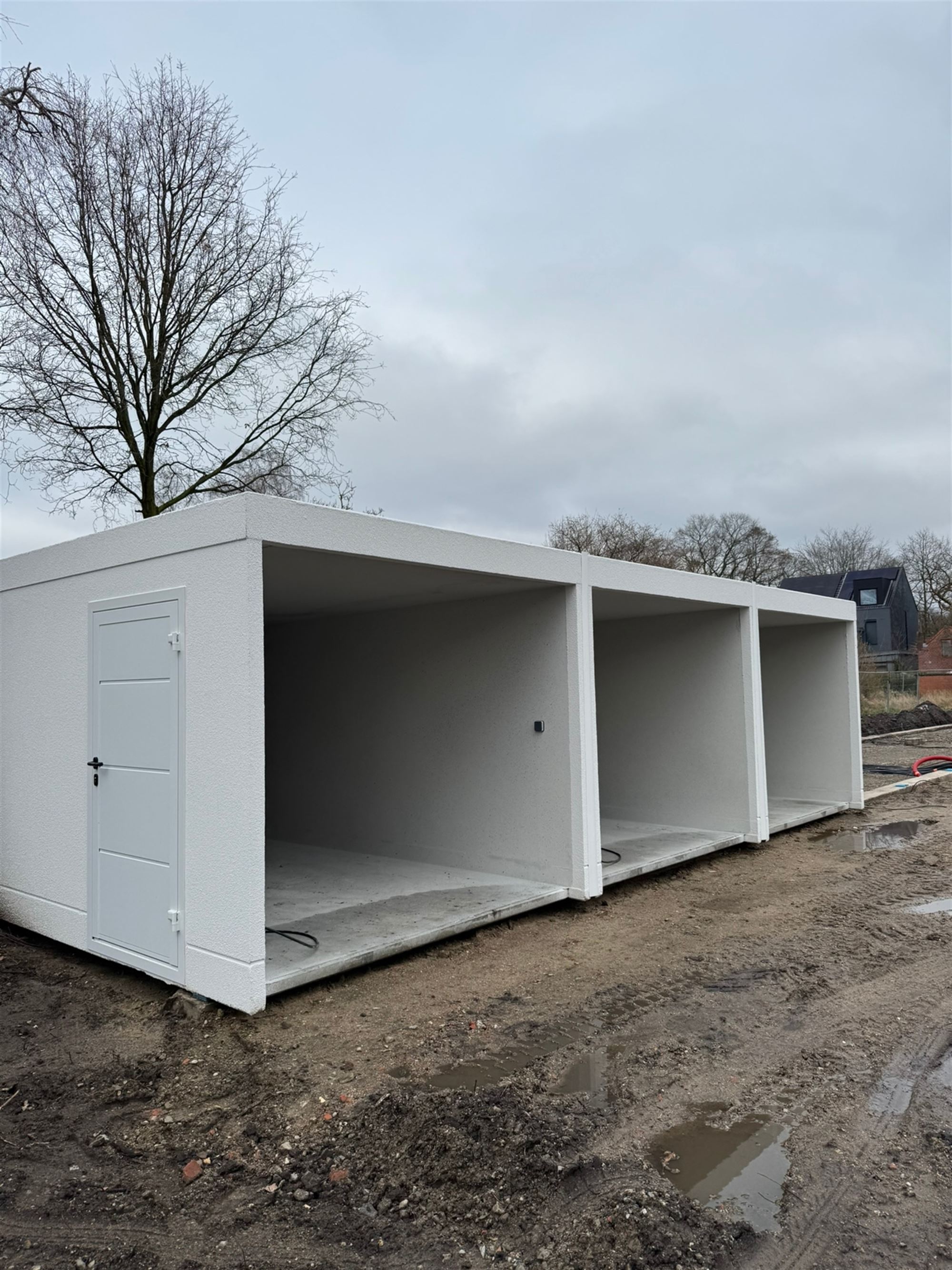 Nieuwe prefab garagebox(en), uitgerust met een sectionale poort (witte uitvoering en geautomatiseerd) en volgende voorzieningen aanwezig: elektriciteit (lichtpunt en stopcontacten) en, in de gemeenschappelijke technische ruimte, water.