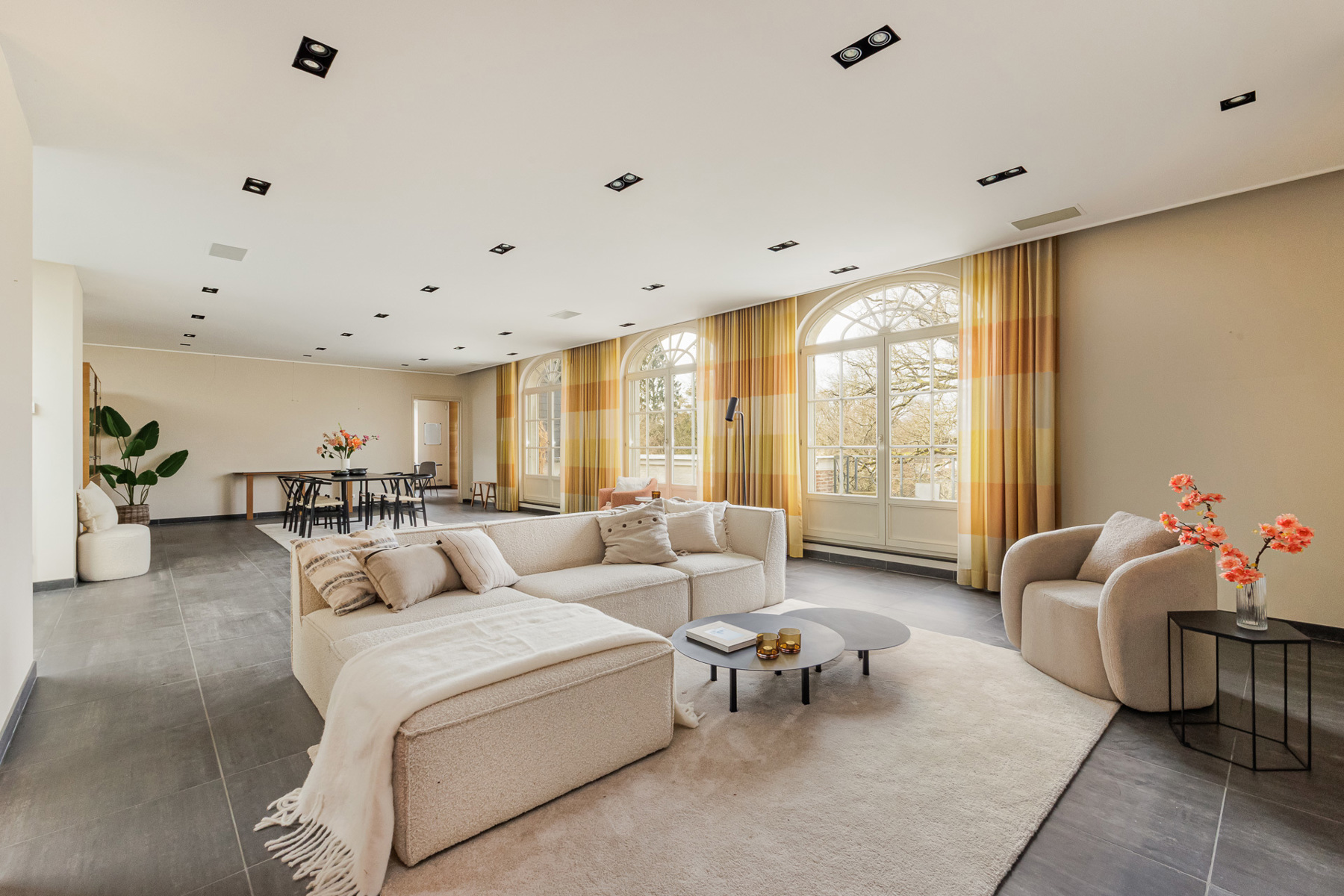 Riante leefruimte 67 m² op tegel met gashaard en ingemaakte kasten via grote dubbele ramen toegang tot terras.