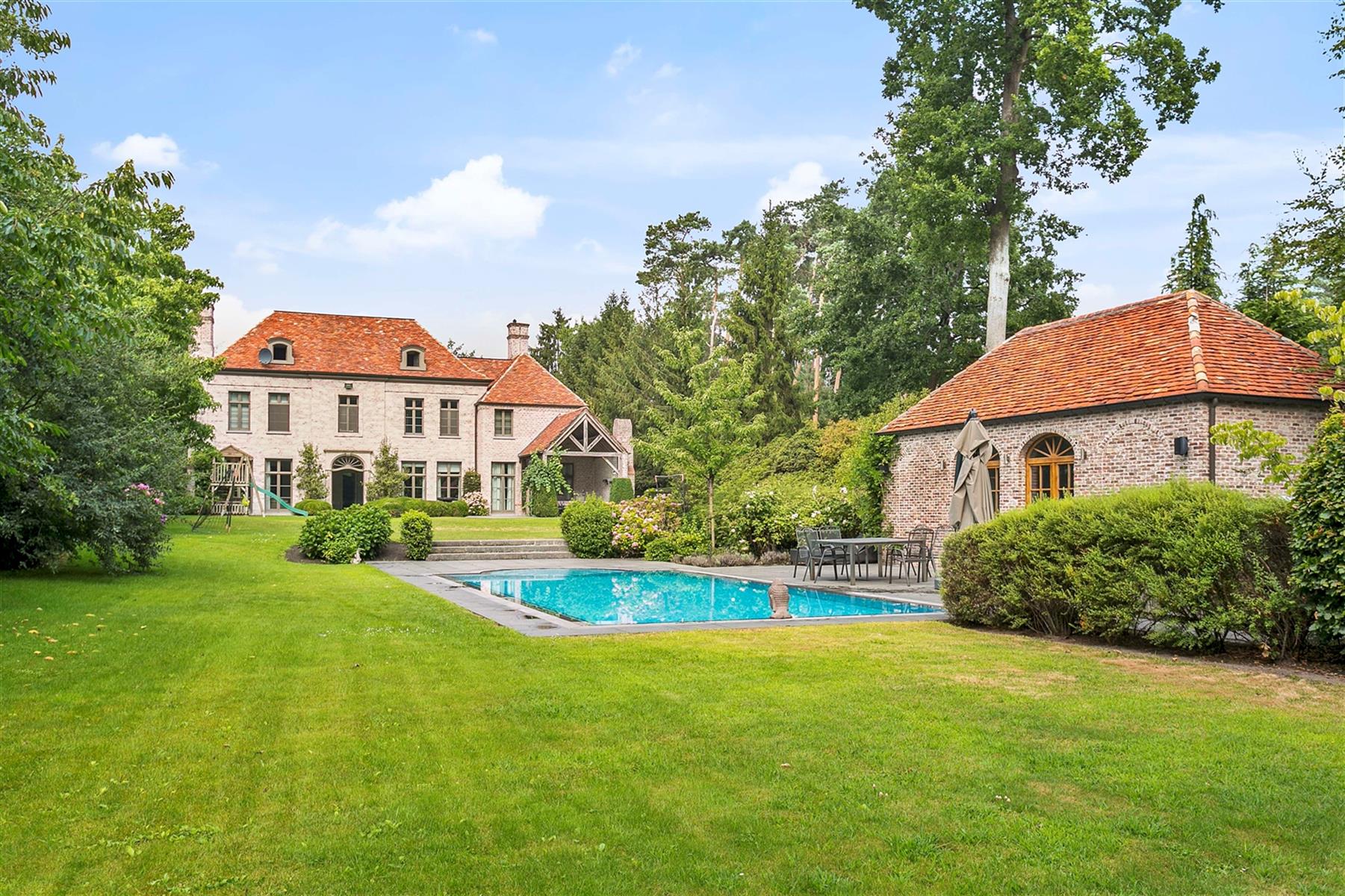 Zwembad 5,5m x 12m verwarmd via warmtepomp met automatisch roldek en aanpalend terras 80m² met jacuzzi.