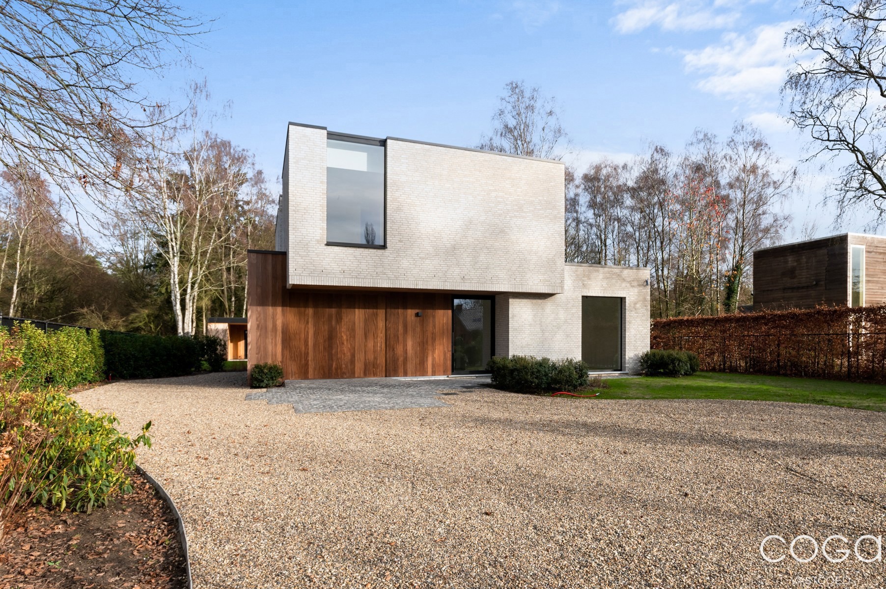 Exclusief afgewerkte nieuwbouwvilla op 2.295m² met prachtig buitenzwembad! Het eigendom is gelegen op een rustige, groene en goed bereikbare locatie nabij de Brabohoeve. De villa werd in 2025 opgetrokken met de beste materialen en voorzien van alle hedendaagse comfort (warmtepomp, vloerverwarming- en koeling, balansventilatie, zonnepanelen, domotica, ...). Het super gunstige E-peil bedraagt E8. De knappe architectuur van de hand van ArchiMO Architecten combineert een witgrijs genuanceerde gevelsteen met Afrormosia gevelbekleding en grote plafondhoge raampartijen in zwart buitenschrijnwerk. De superieure binnenafwerking voorziet onder meer overvloedig maatwerk, kamerhoge blokdeuren, eiken parket, natuursteen, notelaar fineer en microtopping.