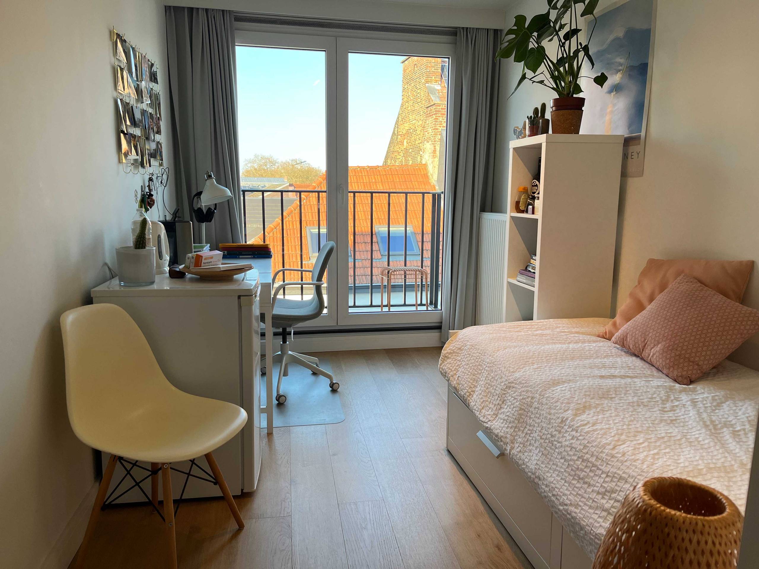 - Veel lichtinval, zicht op de toren van Ladeuze-bibliotheek en weinig hinder van de geluiden op straat