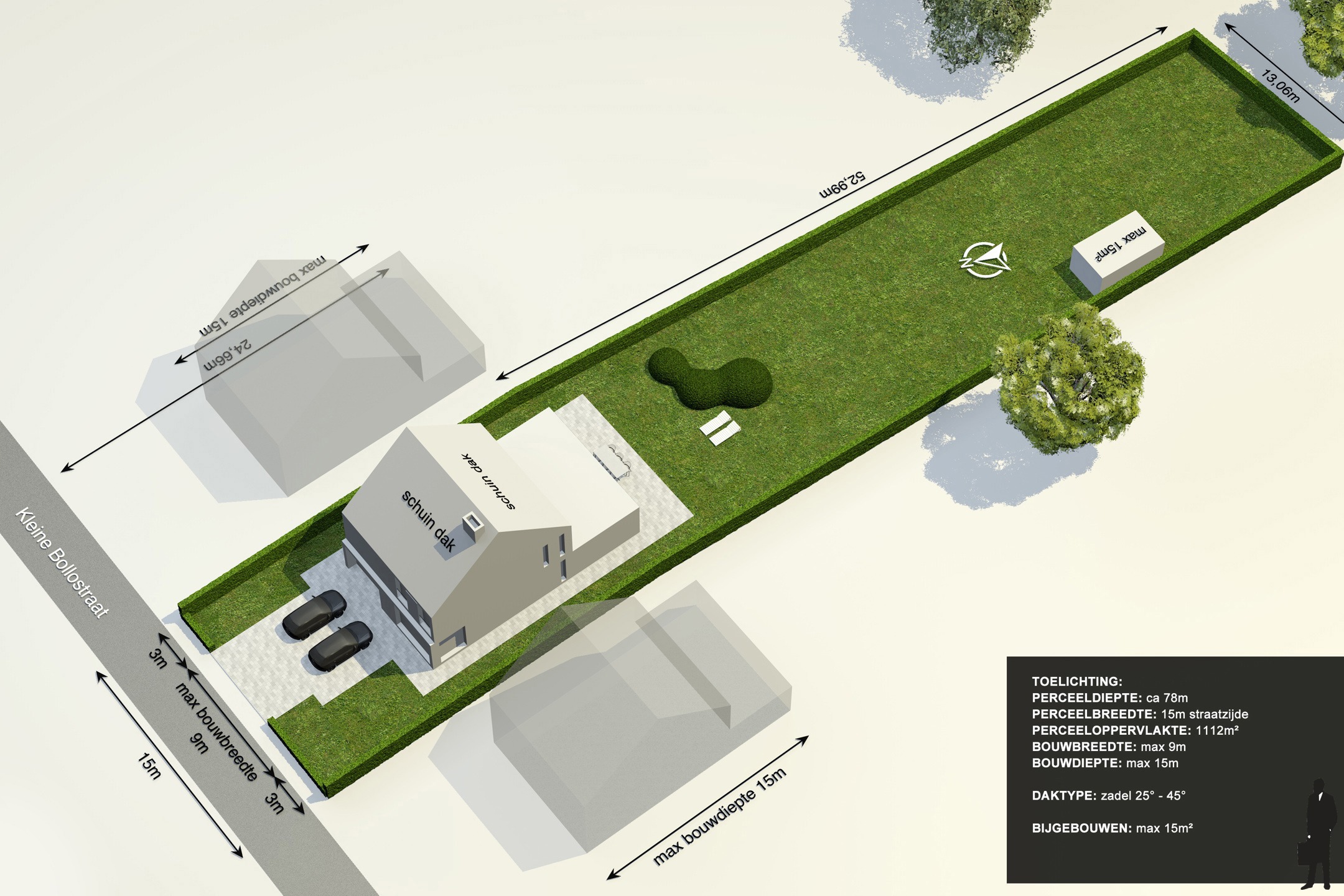 Bouw hier uw droomwoning met een bouwdiepte van max 15m op gelijkvloers en 12m op verdieping. Ook kamers onder het dak of een aanbouw met plat dak is toegelaten. Bijgebouw dienstig als tuinberging is toegelaten met een max oppervlakte van 15m² & een max. hoogte van 3m.