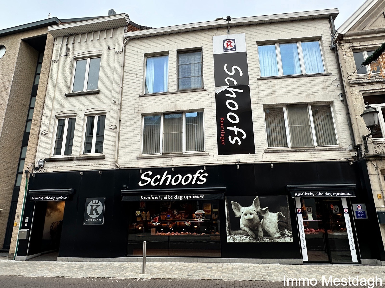 Het gelijkvloers is momenteel ingericht als gerenommeerde Keurslagerij. Dankzij de indrukwekkende oppervlakte en de kamerhoge raampartijen aan de straatkant geniet u hier van een maximale visibiliteit.