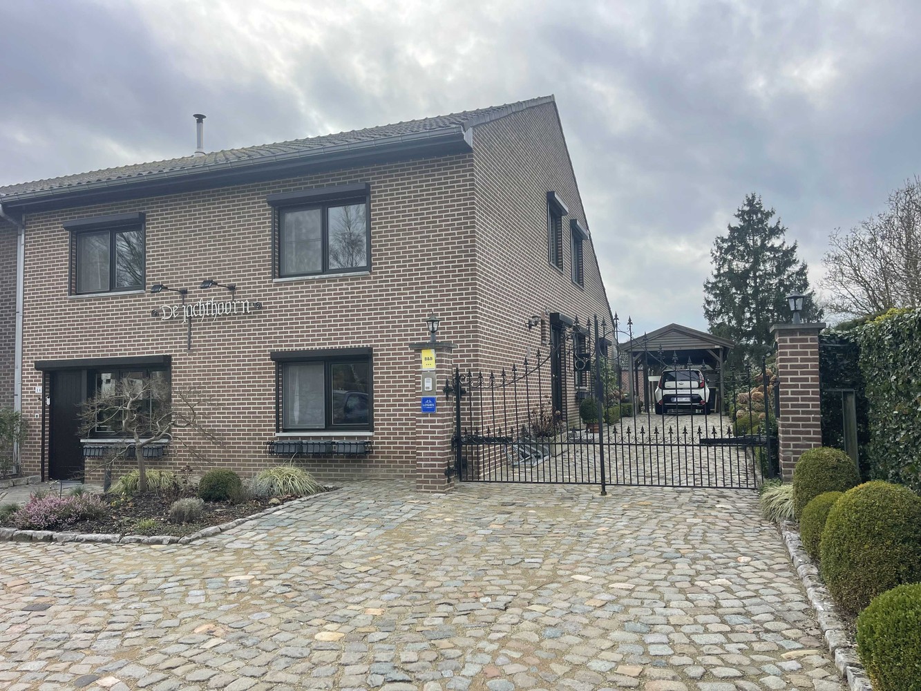 De tuin is netjes aangelegd met parkeerplaatsen vooraan en een overdekt terras met BBQ, een tuinpaviljoen én een vijver achteraan. De hagen, beplanting en bestrating zorgen voor een mooie en groene omkadering.