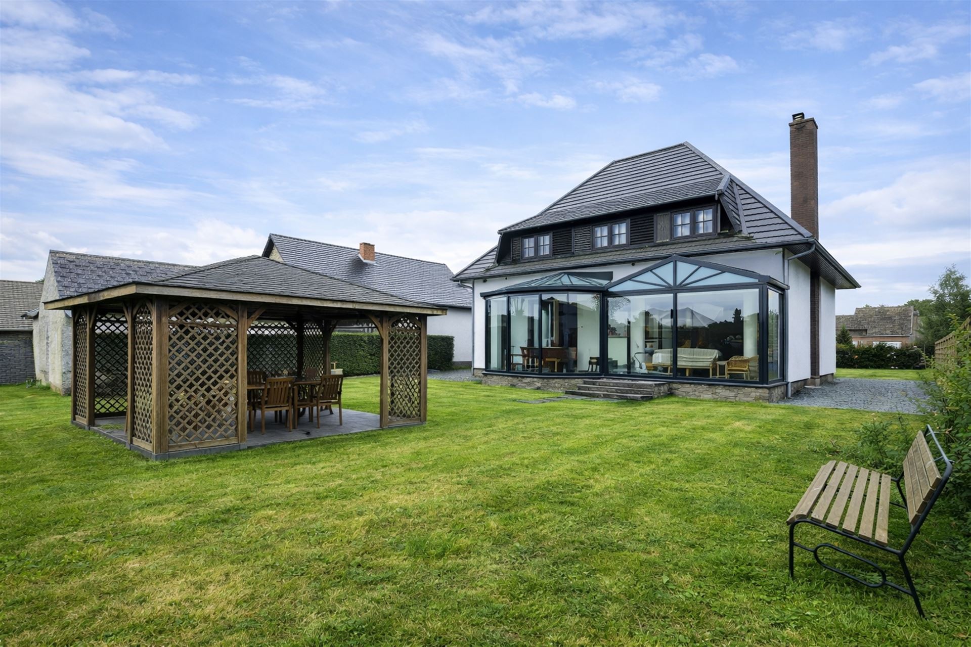 De stijlvolle glazen veranda biedt een prachtig zicht op de groene tuin en vormt een natuurlijke uitbreiding van de leefruimte. Dankzij de grote glaspartijen geniet u hier het hele jaar door van een aangename lichtinval en tuinbeleving.