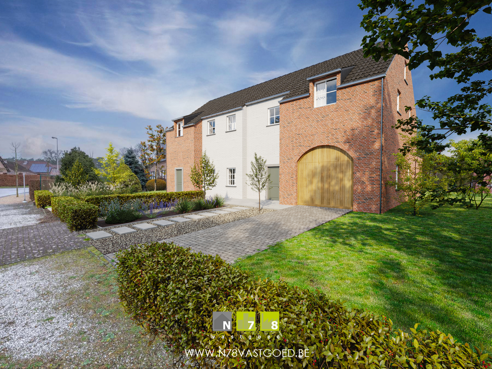 De render geeft 2 klassieke, landelijke halfopen bebouwingen weer, passend bij het straatbeeld. Houd er rekening mee dat deze afbeeldingen louter ter illustratie dienen. Voor de realisatie van de woningen dient de koper zelf een omgevings- en/of verkavelingsvergunning aan te vragen; er is momenteel geen vergunning aangevraagd door de verkoper.