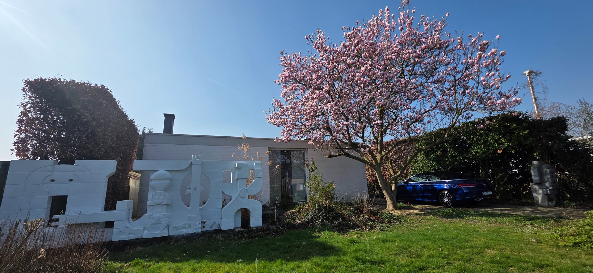 De beeldhouwwerken in de voortuin en patio fungeren als symbool en verlengstuk van de architectuur. Kunst en gebouw zijn onlosmakelijk met elkaar verbonden. Meer dan een huis is dit een creatieve biotoop. Door zijn integrale ontwerpvisie creëerde de architect een omgeving die inspireert.
