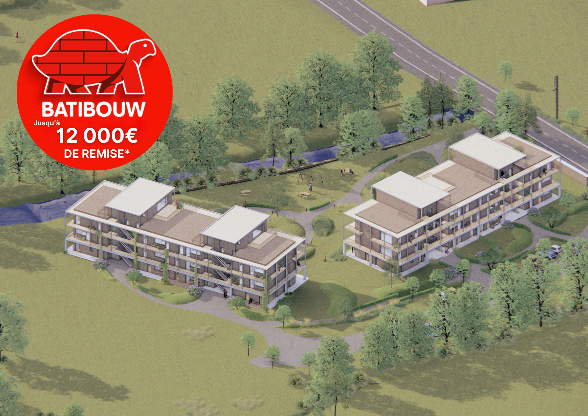 • Appartements spacieux et lumineux, de 1 à 3 chambres, avec grandes terrasses et vues dégagées sur la nature environnante dont un petit bois à l'arrière
