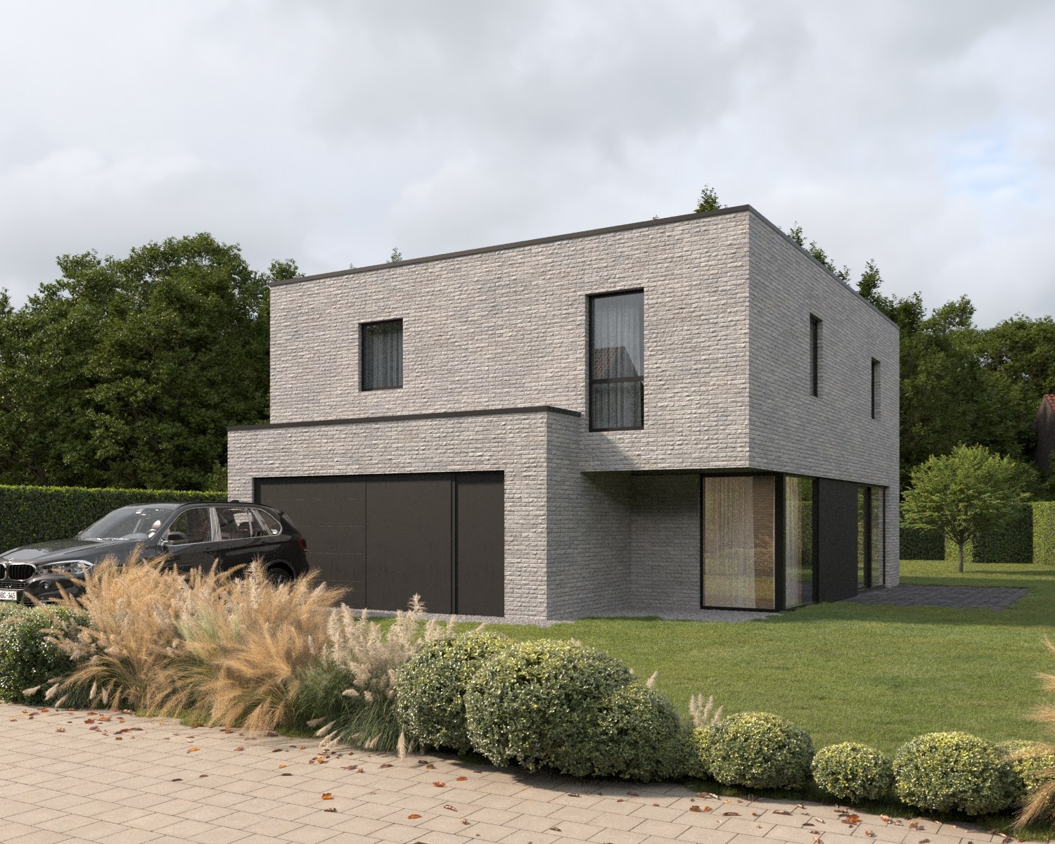 - Inkomhal- Gastentoilet- Leefruimte met open keuken- Trap naar boven- Berging- Inpandige garage