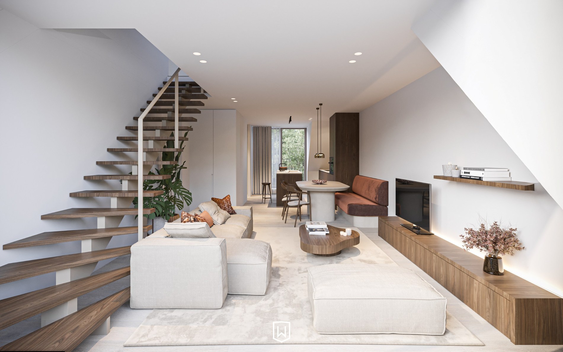 Een super leuk derde verdiep met de leefruimte en de keuken. De leefruimte geeft uit op het terras aan de straatkant. Op dit terras kan een tafel geplaatst worden. De keuken is open en ligt achteraan het appartement. Hier een tweede terras met de ochtendzon. Op deze verdieping verder een bergruimte/wasplaats en een toilet. In de dakverdieping twee slaapkamers en een ingerichte badkamer .
