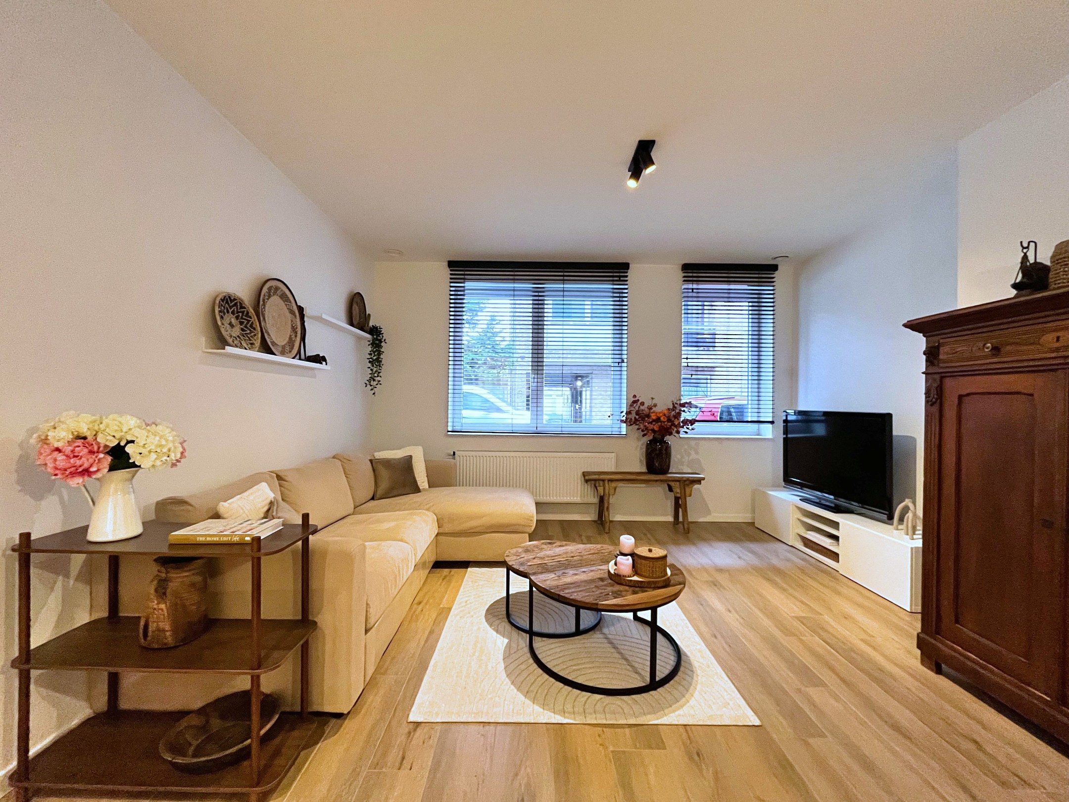 Het appartement bevindt zich op het gelijkvloers van een mooi gebouw. Ook het appartement werd smaakvol ingericht met mooie materiaalkeuzes doorheen het appartement.