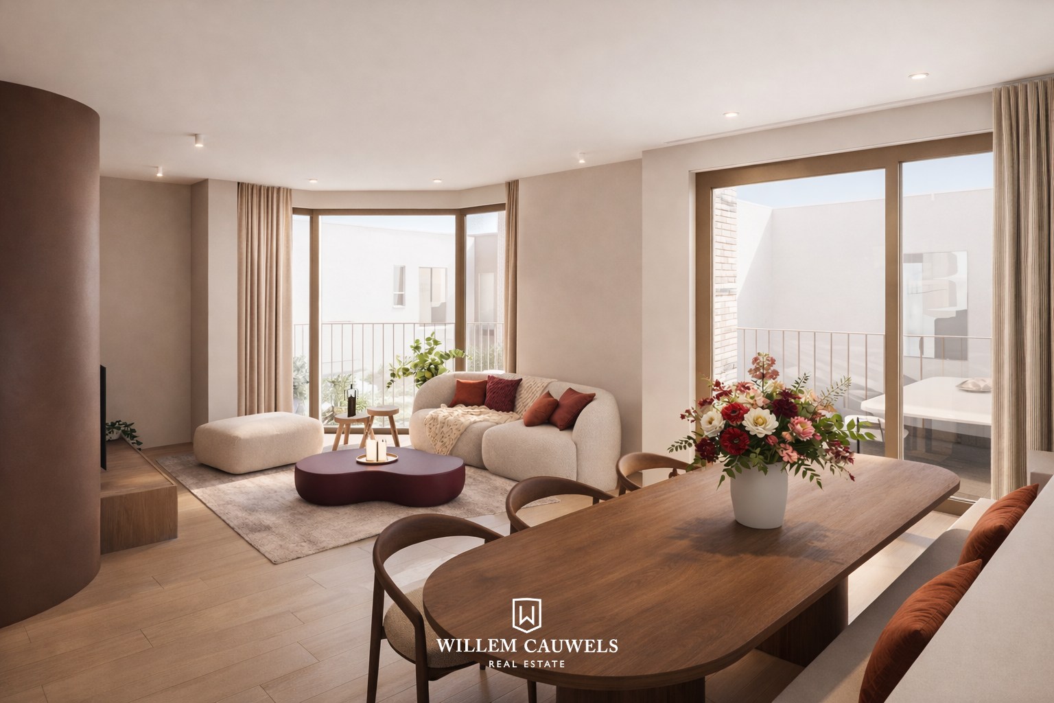 De ruime en aangename leefruimte geniet van veel natuurlijke lichtinval dankzij de grote raampartijen en de unieke hoekligging. Aansluitend bevindt zich de open, volledig uitgeruste keuken met zicht op de eet- en zithoek. Vanuit de leefruimte heb je toegang tot het terras.