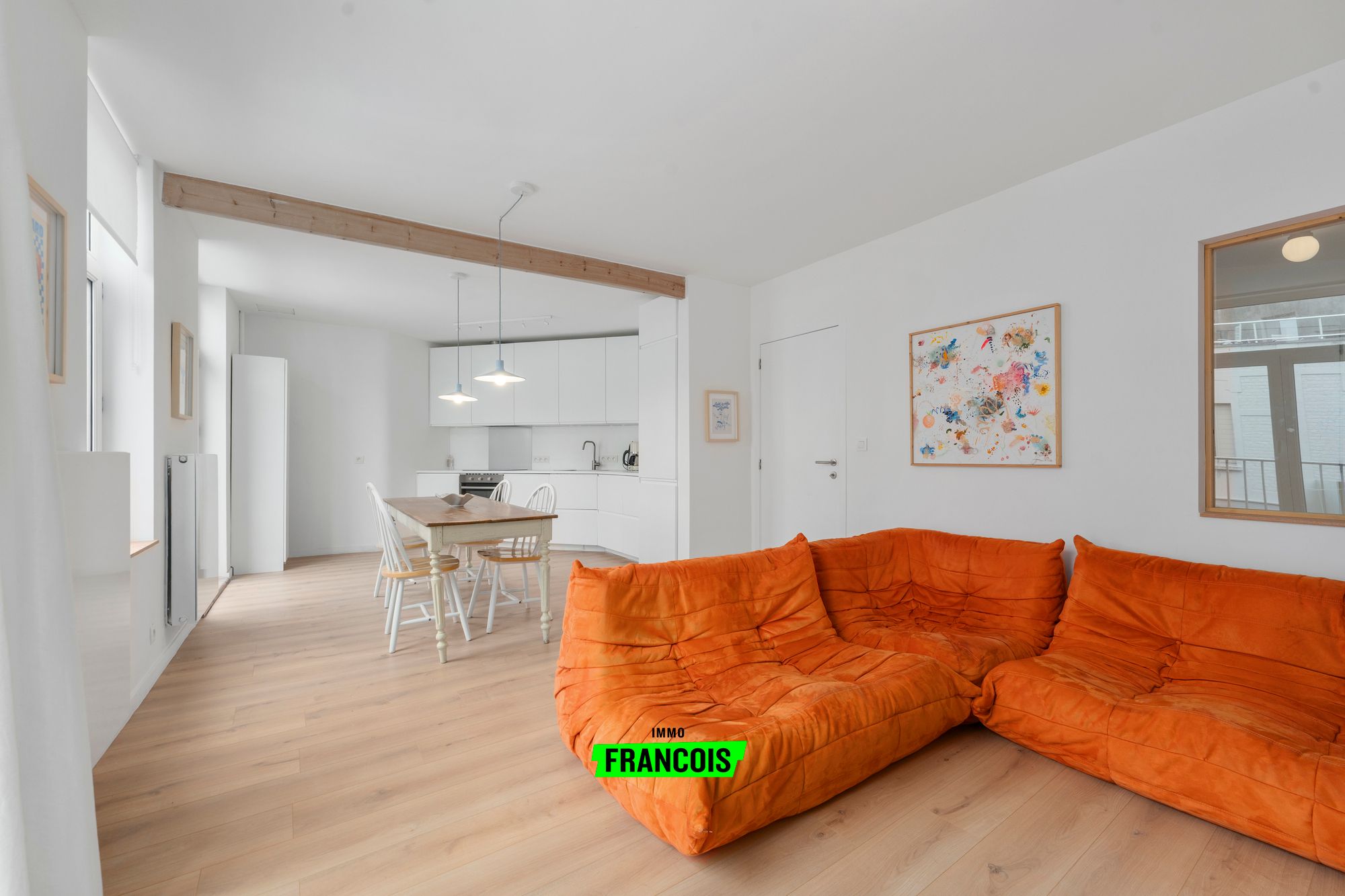 Het appartement beschikt over één volwaardige slaapkamer en een tweede kamer die bereikbaar is via de slaapkamer, ideaal als dressing, bureau of kinderkamer. Deze indeling biedt extra flexibiliteit zonder in te boeten aan comfort. Daarnaast is er een praktische badkamer en een volledig uitgeruste keuken, perfect afgestemd op hedendaags wooncomfort.