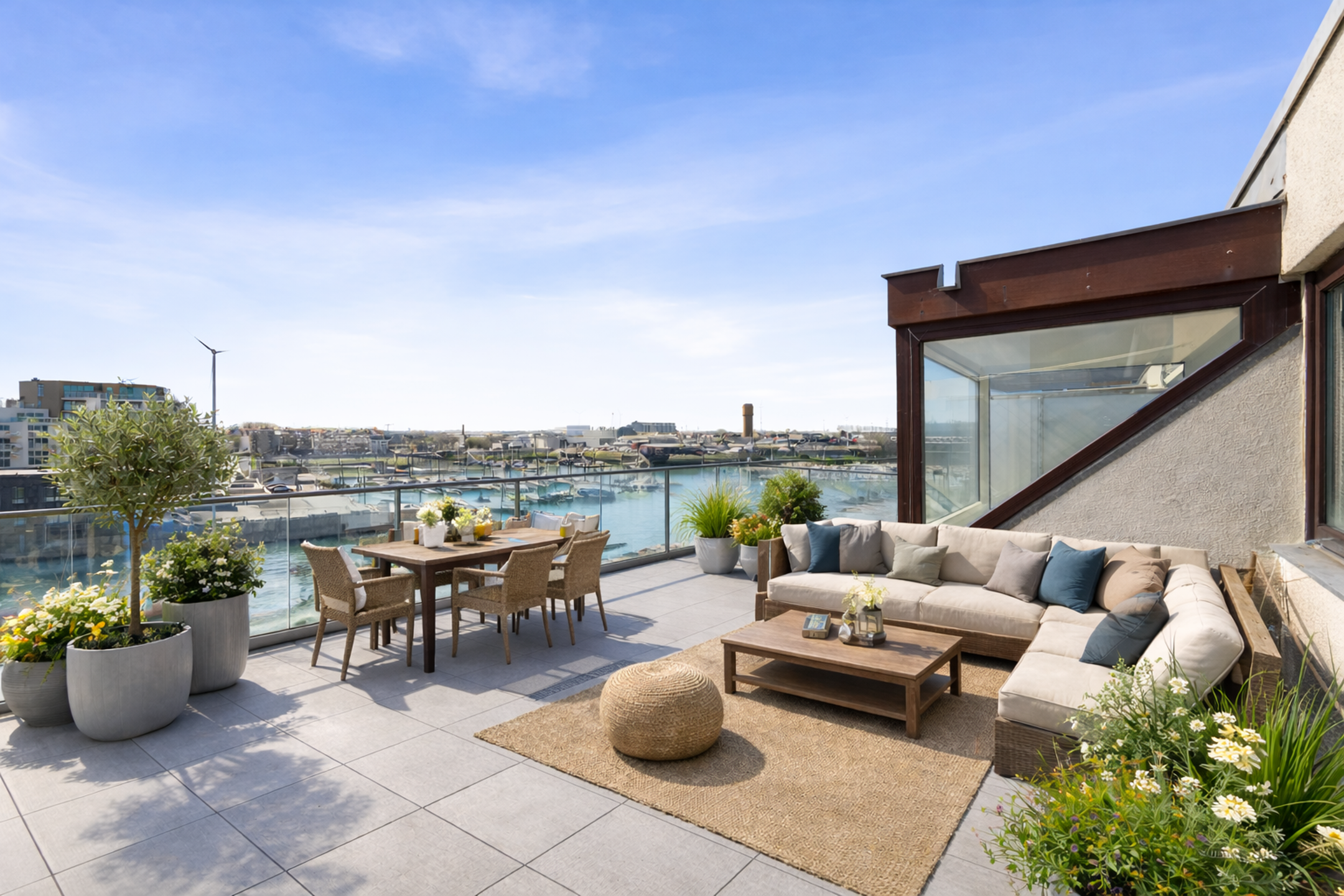 Dit stijlvolle penthouse biedt een super mooi en open zicht op de jachthaven, en beschikt over twee ruime terrassen waar u van ’s morgens tot ’s avonds kunt genieten. De inkomhal geeft toegang tot een praktische dressing, een lichte leefruimte met aansluitende keuken en eethoek. In de leefruimte is bovendien een mogelijkheid om een slaaphoek te instaleren, ideaal als extra slaapruimte of logeerplek.