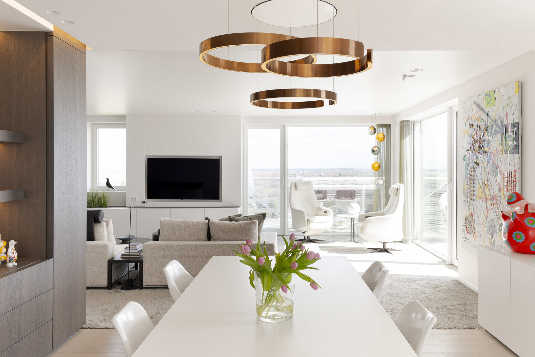 Bij het betreden van het appartement openen de lichtrijke leefruimtes zich in een harmonieus geheel, waar grote raampartijen en directe toegang tot de terrassen zorgen voor een naadloze verbinding tussen binnen en buiten. De semiprofessionele keuken van V-ZUG, van Zwitserse makelij, is volledig uitgerust voor wie koken en genieten wil combineren op het hoogste niveau. Aansluitend bevindt zich een praktische bijkeuken met koelcel, discreet geïntegreerd in het geheel.