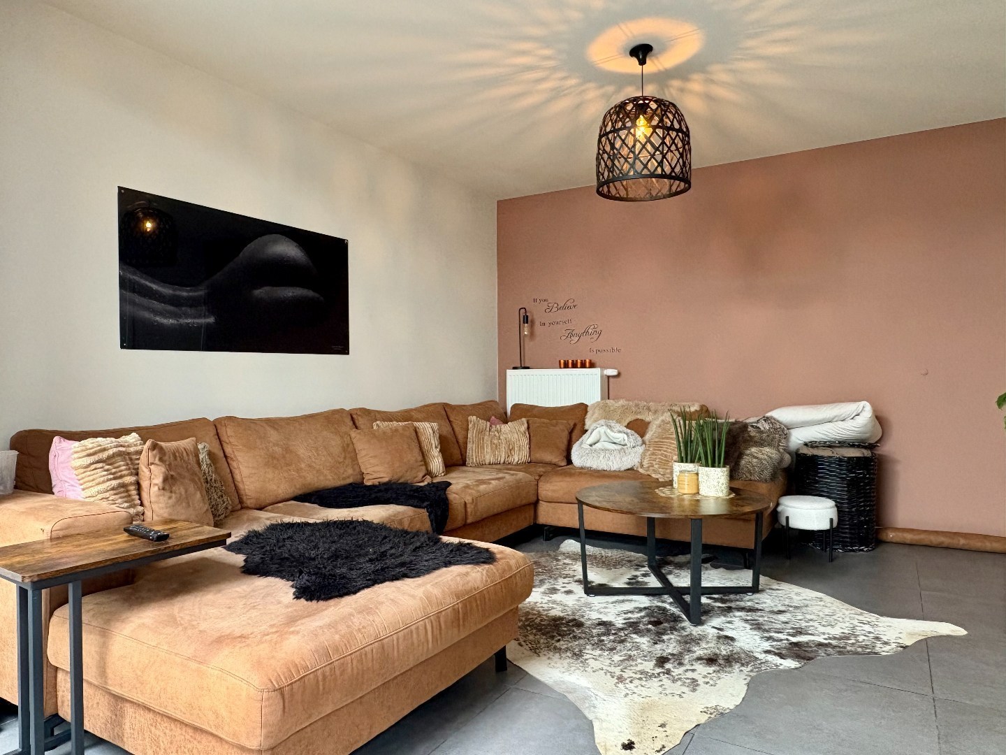 Bij het binnenkomen van de woning betreed je de lichtrijke leefruimte met uitzicht op de tuin. Aansluitend bevindt zich de moderne, volledig uitgeruste keuken met keukeneiland. Vanuit de keuken heb je toegang tot een praktische berging met aansluiting voor de wasmachine en extra opslagruimte. Daarnaast beschikt de woning over een kelder en een handige zijdoorgang langs de linkerkant, ideaal voor het plaatsen van fietsen.