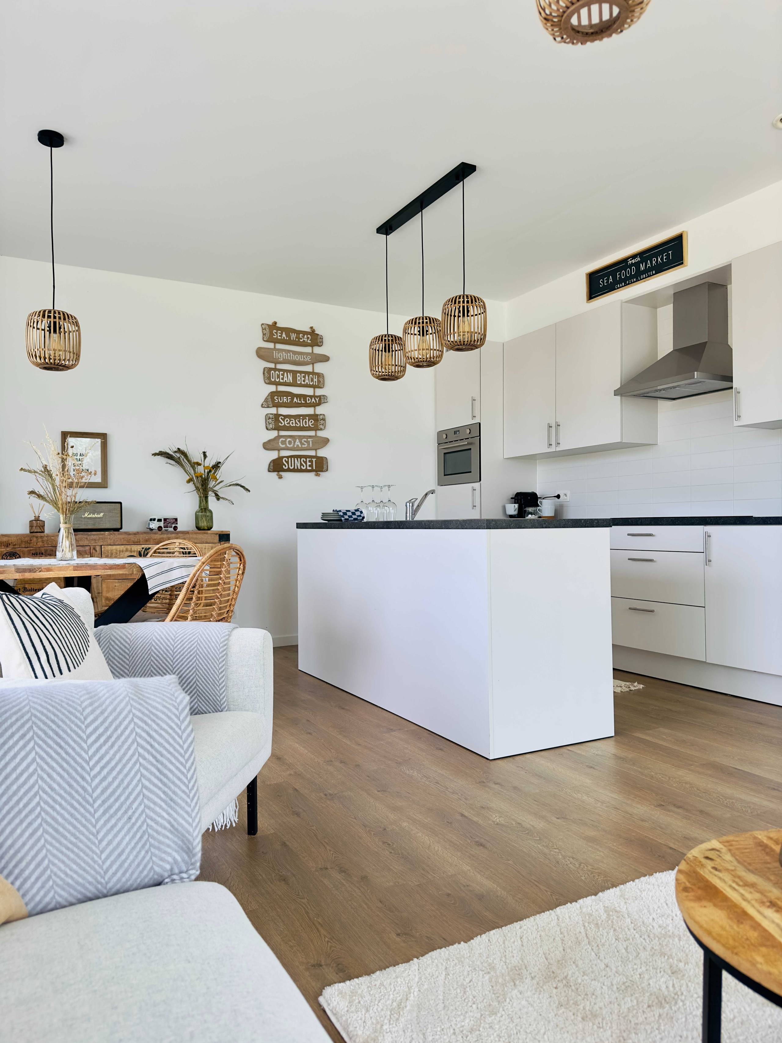 De leefruimte bestaat uit een ingerichte keuken en grote schuiframen die zorgen voor een heerlijk open gevoel en heel veel lichtinval.