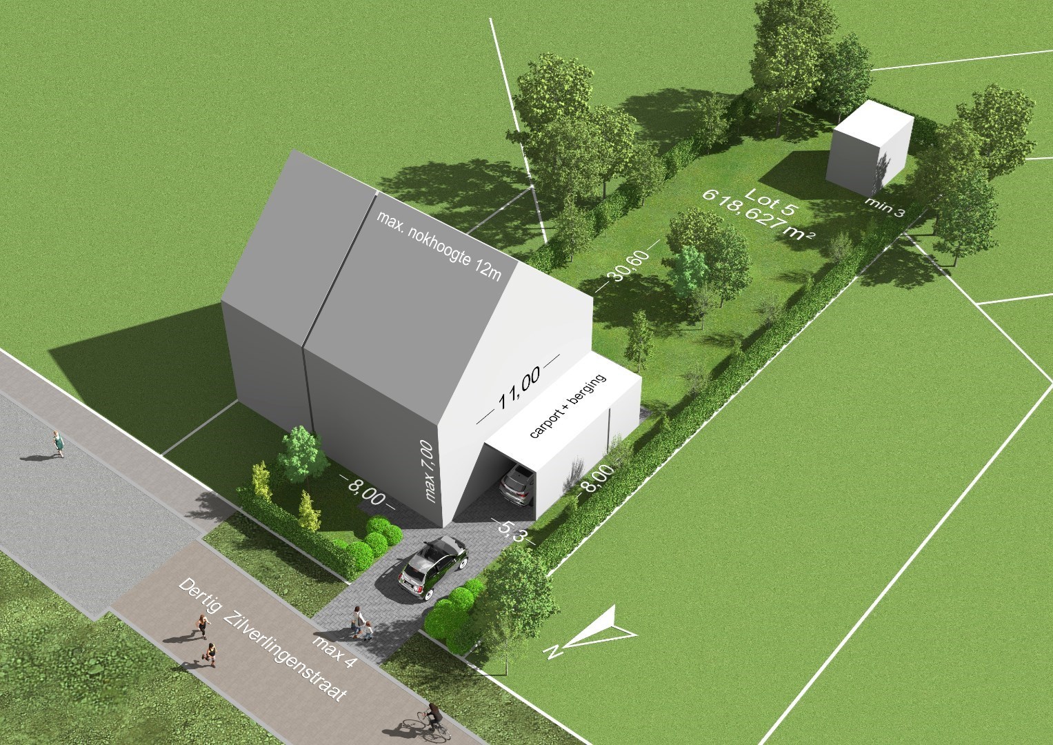 U kan hier een half open woning bouwen waarbij een afstand van minimum 5 meter tot de perceelsgrenzen moet behouden blijven. Er kan dus een woning voorzien worden met een gevelbreedte van 8 meter en een bouwdiepte van 11 meter.