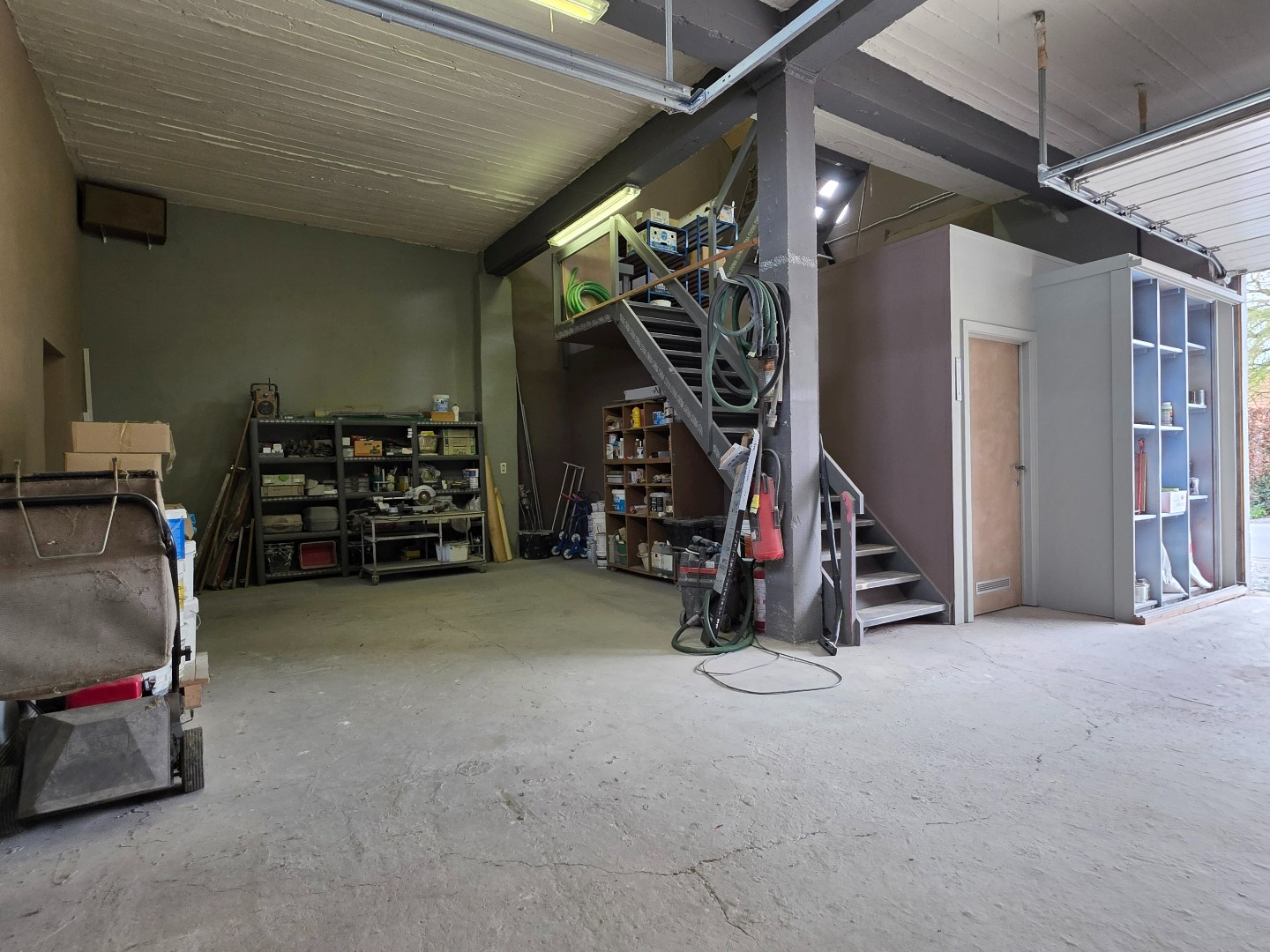 Op de benedenverdieping vinden we naast de inrijpoort een handige bureelruimte die bvb ook dienst kan doen als showroom. De grote vrije ruimte in L-vorm biedt via een tweede sectionaalpoort rechtstreeks toegang tot de tuin. Via een deur komen we in een achterliggende, bijkomende werkruimte.