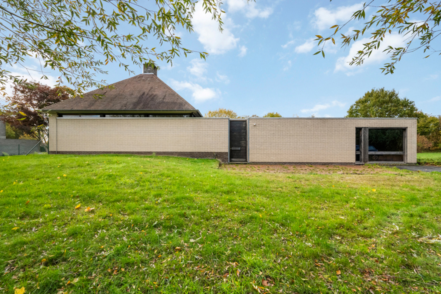 Grote onderhoudsvriendelijke tuin rondom de woning met vijver ter hoogte van het terras. De vijver werd voorzien van alle technieken om dienst te doen als koi-vijver.