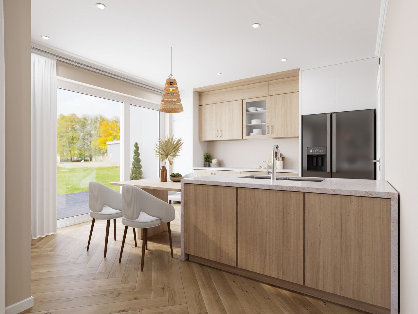 -Gelijkvloers: Inkomhal met plaats voor een vestiaire - apart toilet - Zeer lichtrijke leefruimte met plaats voor een grote eettafel alsook het inrichten van uw salon - aansluitend vinden we ook nog een bureauhoek - Aansluitend aan het eetgedeelte vinden we de open keuken met zicht op de zongerichte tuin - Deze open keuken is voorzien voor een eiland - Aansluitend aan de keuken vinden we een uiterst praktische berging voor het plaatsen van uw voorraad alsook uw wasmachine en droogkast - Deze berging heeft tevens directe toegang tot de carport, wat zeer handig is voor het uitladen van uw boodschappen.