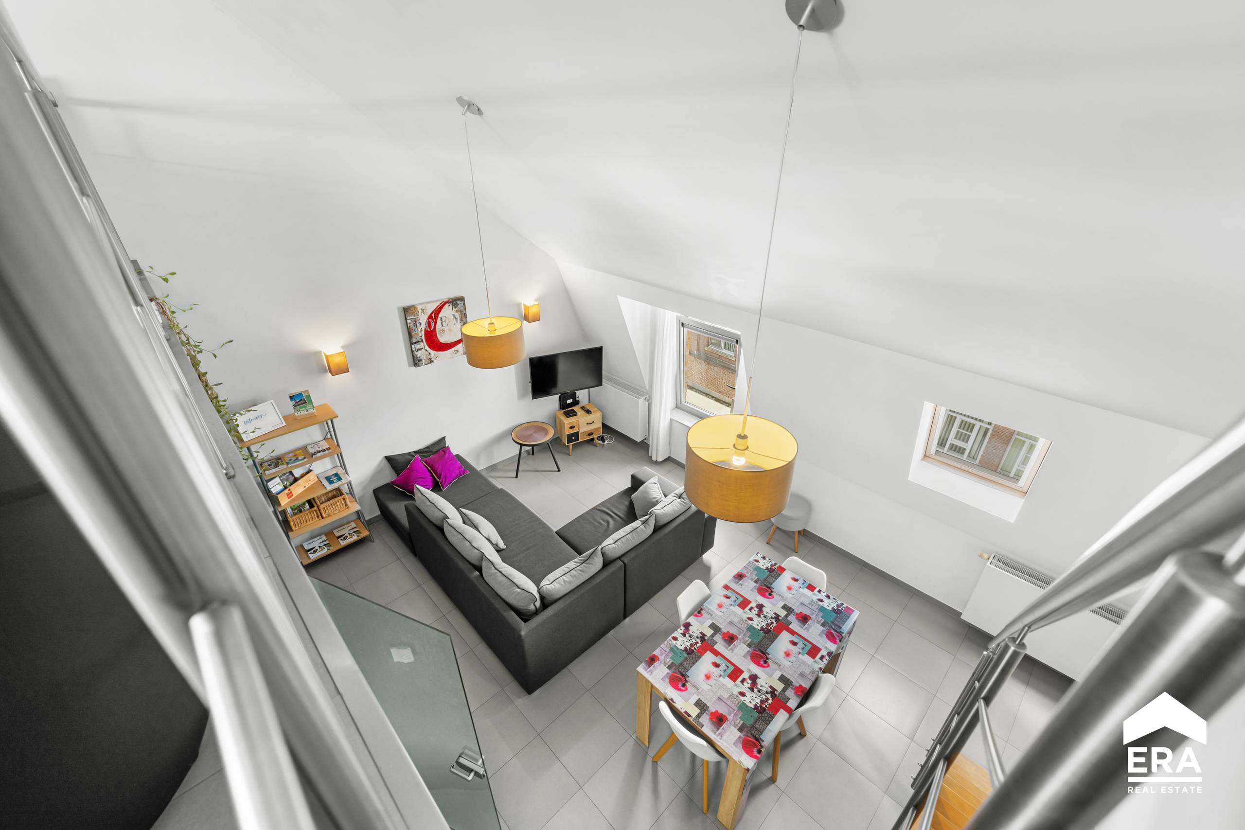 Het appartement bevindt zich op de derde verdieping en omvat een inkomhal met apart toilet, een gezellige leefruimte met open en volledig ingerichte keuken voorzien van ingebouwde kasten, keramische kookplaat, dampkap, frigo, combi-oven en vaatwas. Verder is er een badkamer met lavabo, ingemaakte kasten, ligbad/douche en een ruimte voor wasmachine en droogkast. Daarnaast beschikt het appartement over een ruime slaapkamer, een bureauruimte onder de trap en een mezzanine die momenteel dienstdoet als tweede slaapkamer. Op het gelijkvloers is er een gemeenschappelijke fietsenberging aanwezig.