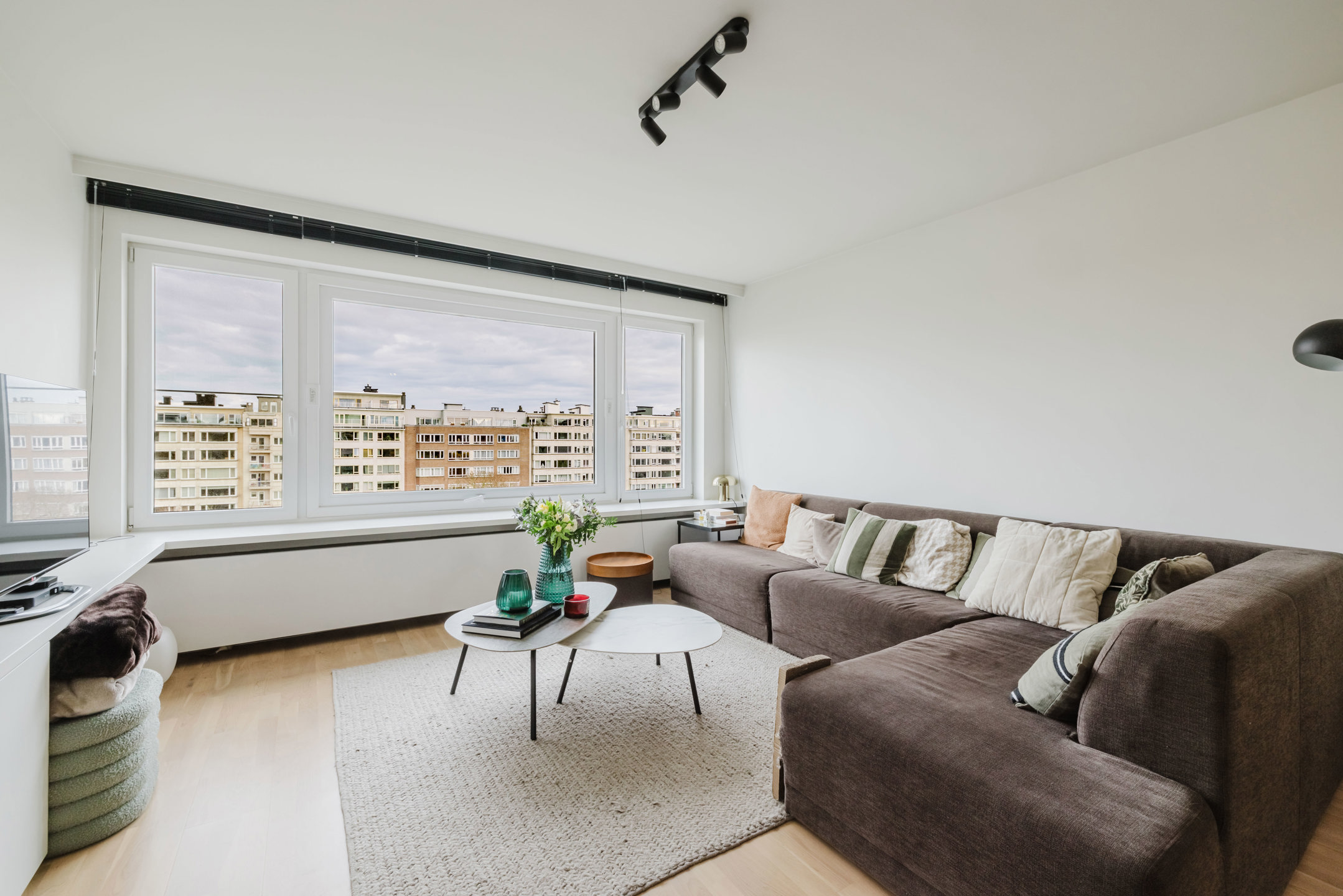 Het appartement bevindt zich op het 7de verdiep en bestaat uit de inkom met vestiaire, de lichtrijke woonkamer met zicht op het Koning Albertpark, de eetplaats met een volledig ingerichte open keuken met buitenruimte, het gastentoilet, de nachthal, de eerste slaapkamer, een badkamer met inloopdouche en 2 slaapkamers met toegang naar het terras met zicht op het Gentse Sint Pietersabdij.