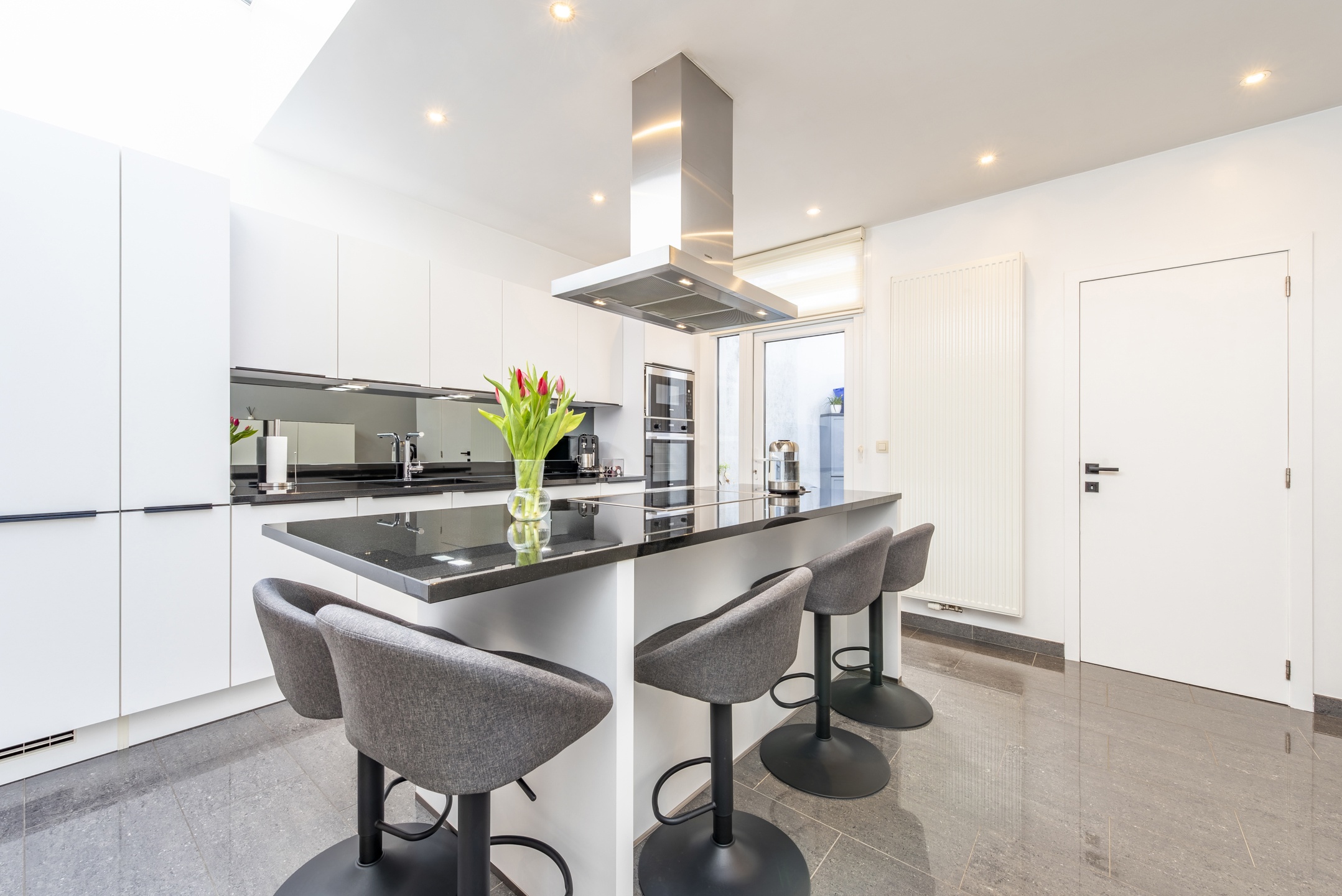 De woning is praktisch, minimalistisch en doordacht ingedeeld. Op het gelijkvloers bevinden zich de inkomhal en een ruime, lichtrijke leefruimte met eethoek. Achteraan in het gebouw vormt de stijlvolle keuken het kloppende hart van de woning. Deze ruimte ademt rust uit dankzij de overvloedige lichtinval via de lichtstraat. Het ontwerp is niet alleen esthetisch, maar ook uiterst functioneel: het eiland biedt volop werkruimte en nodigt uit tot gezelligheid, terwijl de hoogwaardige Siemens-toestellen een professioneel kookcomfort garanderen in een moderne setting. Voorbij de keuken bevindt zich de badkamer, uitgerust met een inloopdouche, toilet en wastafel. De indeling maken het geheel af door een praktische berging en een aansluitende koer.