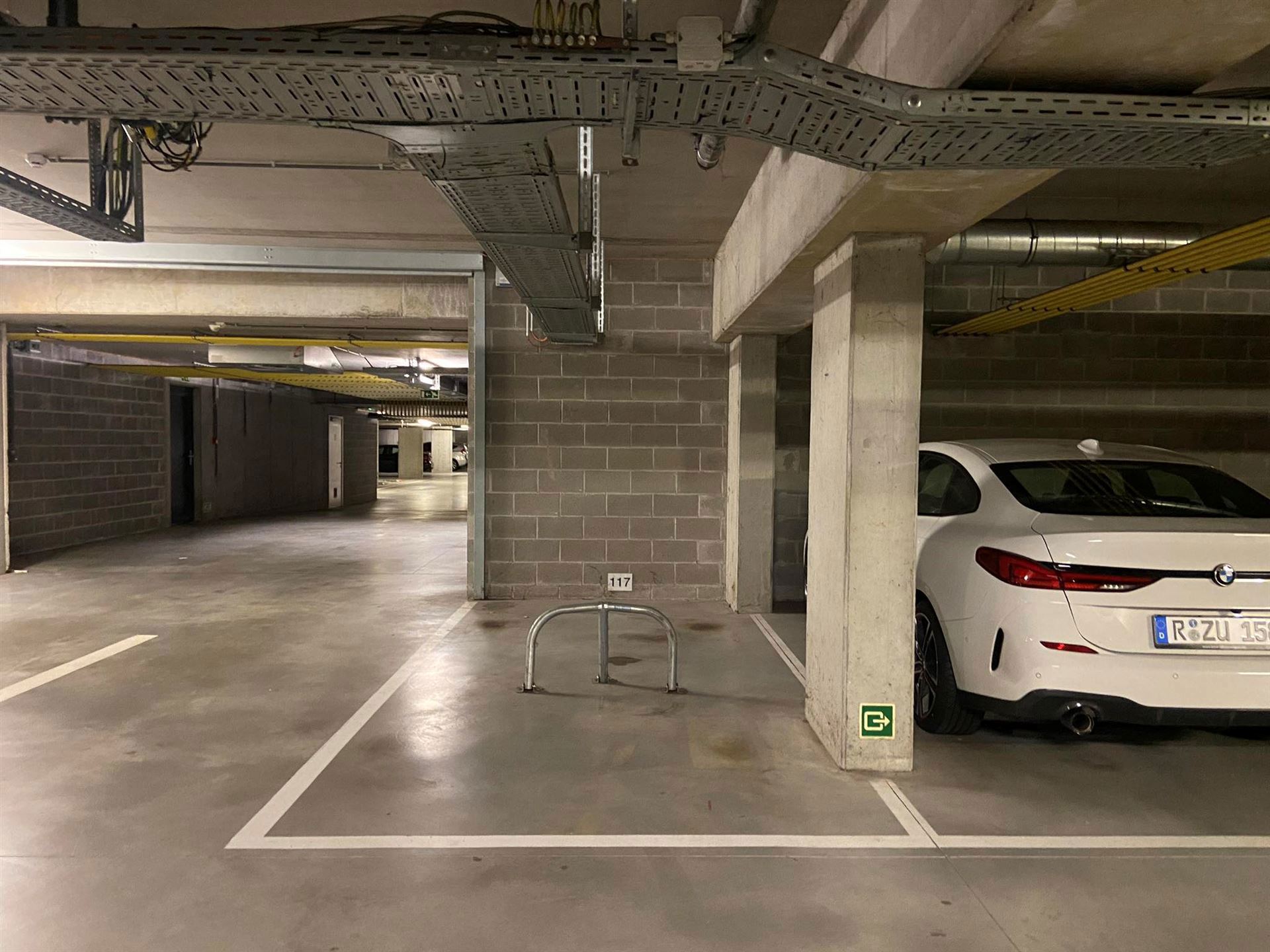 Staanplaats P117 met parkeerbeugel in de kelderverdieping van residentie Leiemeersen II.