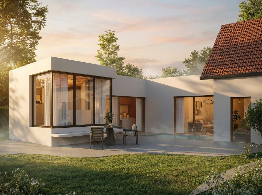 Een interessante opportuniteit voor wie snel wil starten met bouwen. Het project voorziet een stijlvolle bungalow met twee slaapkamers, ontworpen met oog voor licht en ruimte. Grote raampartijen zorgen voor een maximale connectie met de tuin en het voorziene zwembad, waardoor binnen en buiten naadloos in elkaar overvloeien.