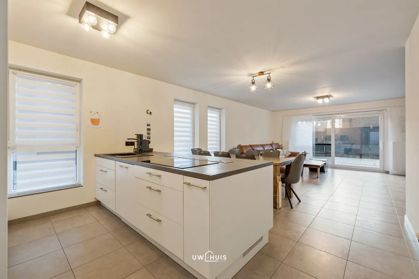 Het appartement beschikt over meer dan 100 m² bewoonbare oppervlakte en is gelegen op het gelijkvloers, wat zorgt voor maximaal gebruiksgemak: geen lift, geen wachttijden en een vlotte toegankelijkheid. De zeer ruime leefruimte met open keuken vormt het hart van het appartement. De keuken is uitgerust met alle moderne voorzieningen en een ruim werkoppervlak, ideaal voor dagelijks comfort en gezellige momenten.