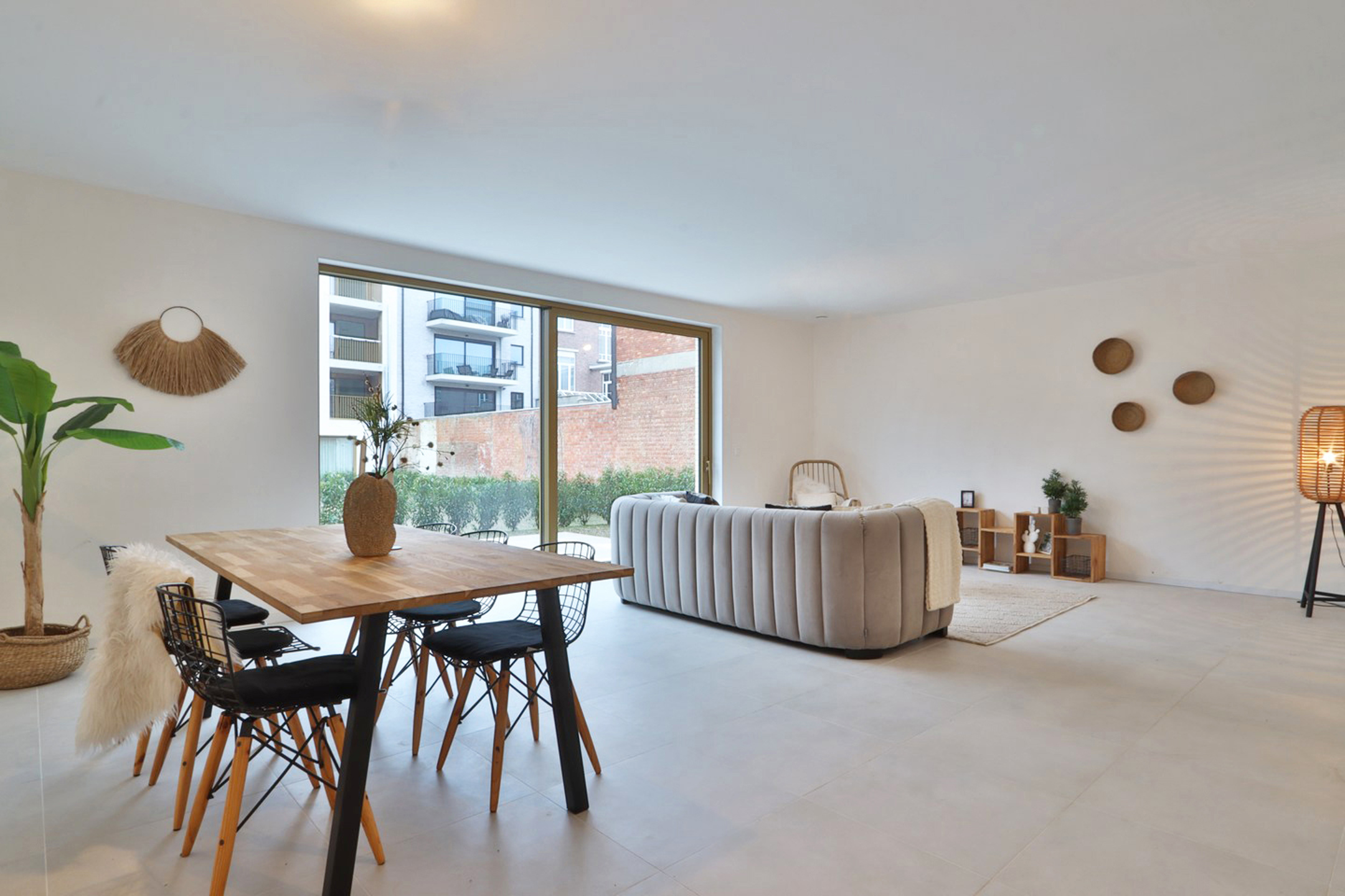 Het appartement beschikt over een bewoonbare oppervlakte van 105,25 m² en omvat twee slaapkamers. De aangename leefruimte geeft uit op het ruime zuidwest georiënteerde terras van 13,6 m², dat afgebakend is met een haagje, waardoor u in alle privacy kan genieten van het buitenleven. De terrassen en tuintjes van de gelijkvloerse appartementen zijn bovendien gelegen in een grote, afgesloten gemeenschappelijke tuin, wat zorgt voor een groene, rustige en veilige woonomgeving.