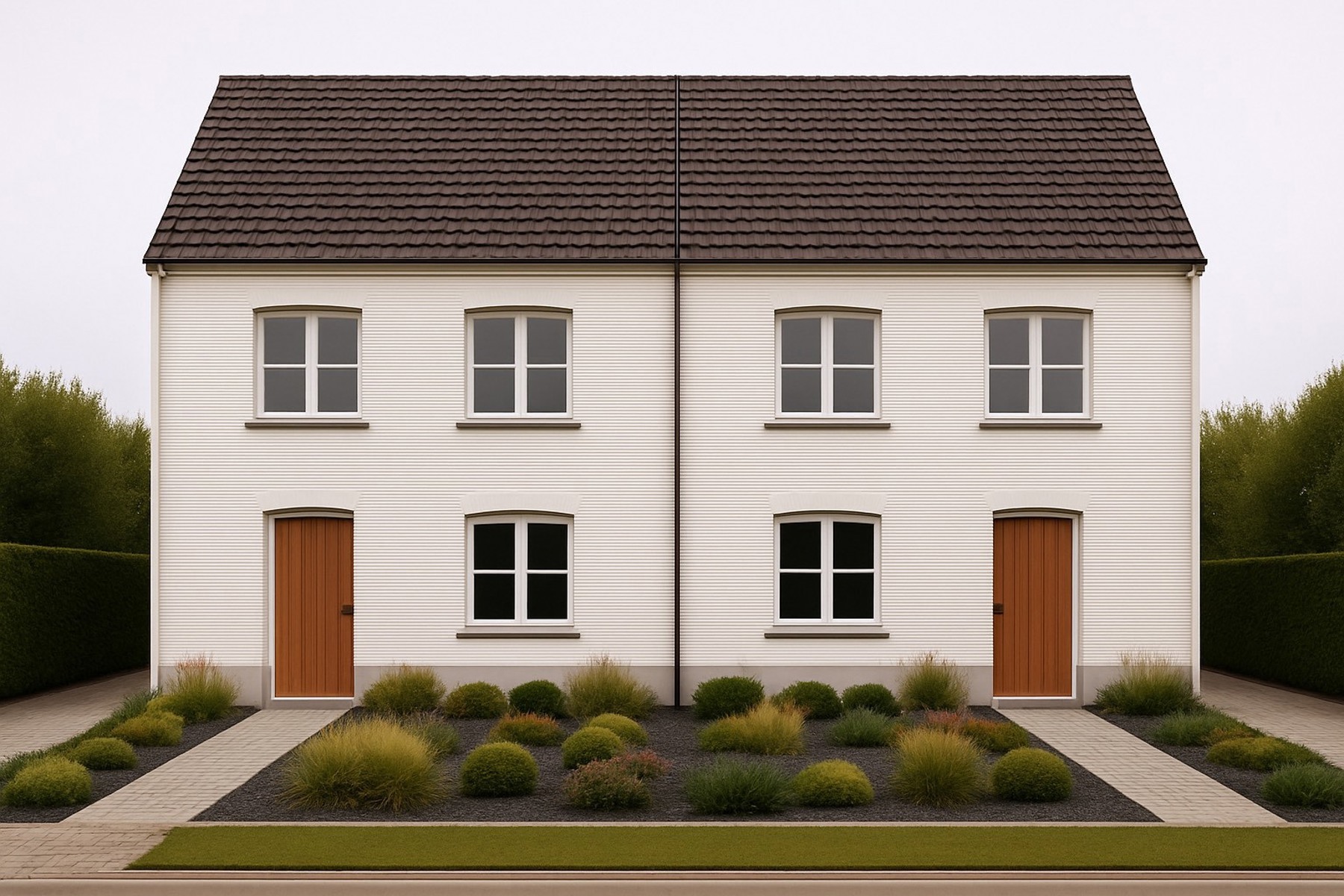 - Bij het gezamenlijk bouwen van twee woningen is het mogelijk om platte daken te voorzien. Zo niet, dan is er een hellingsgraad van 45° vereist.
