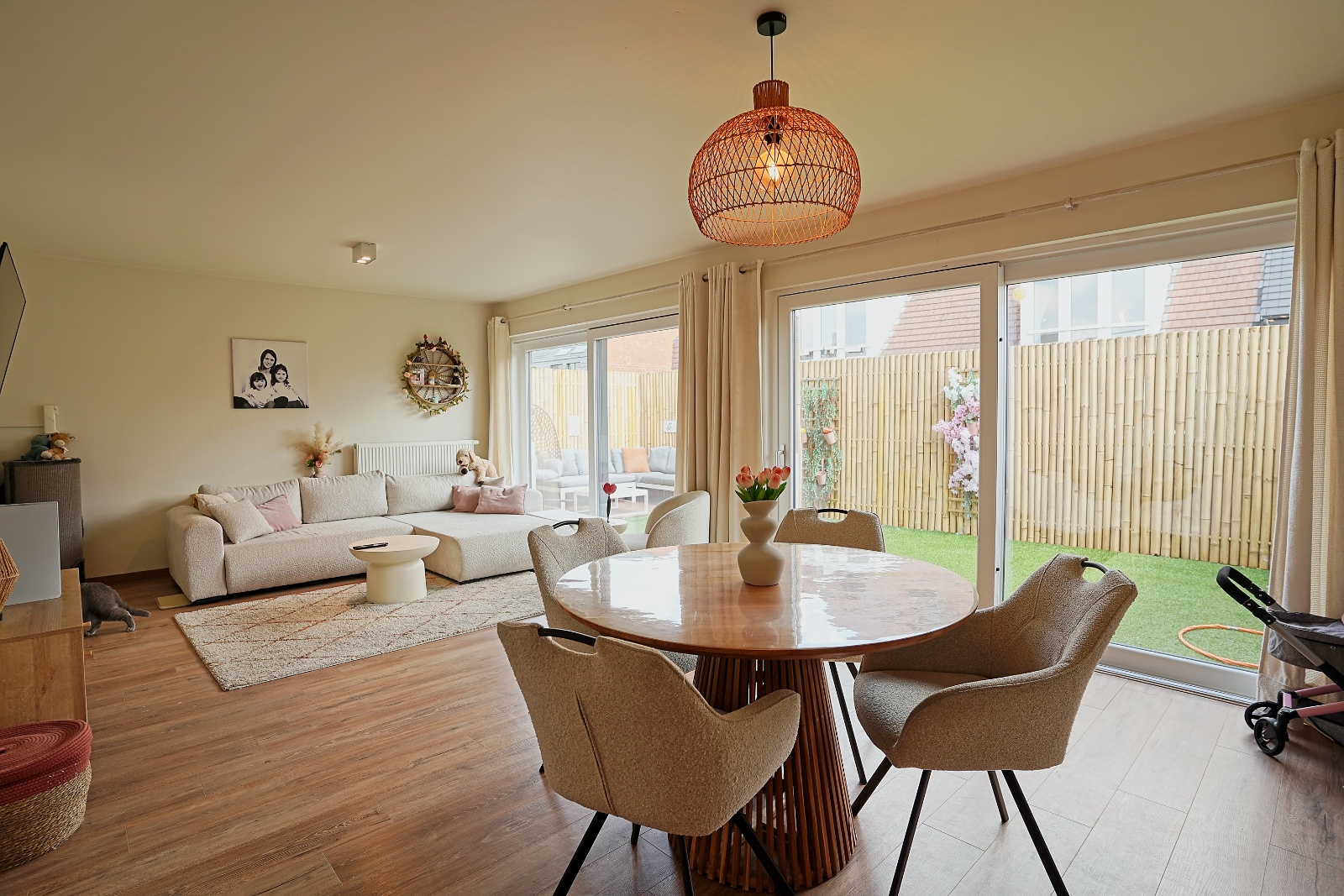Bij het betreden van het appartement komt u in een verzorgde inkomhal met apart gastentoilet. De lichtrijke en ruime woonkamer vormt het kloppend hart van de woning en wordt gekenmerkt door twee grote schuiframen die directe toegang bieden tot een prachtig, royaal terras – de perfecte plek om te ontspannen of gasten te ontvangen. Aansluitend bevindt zich de open, volledig ingerichte keuken met praktische berging.