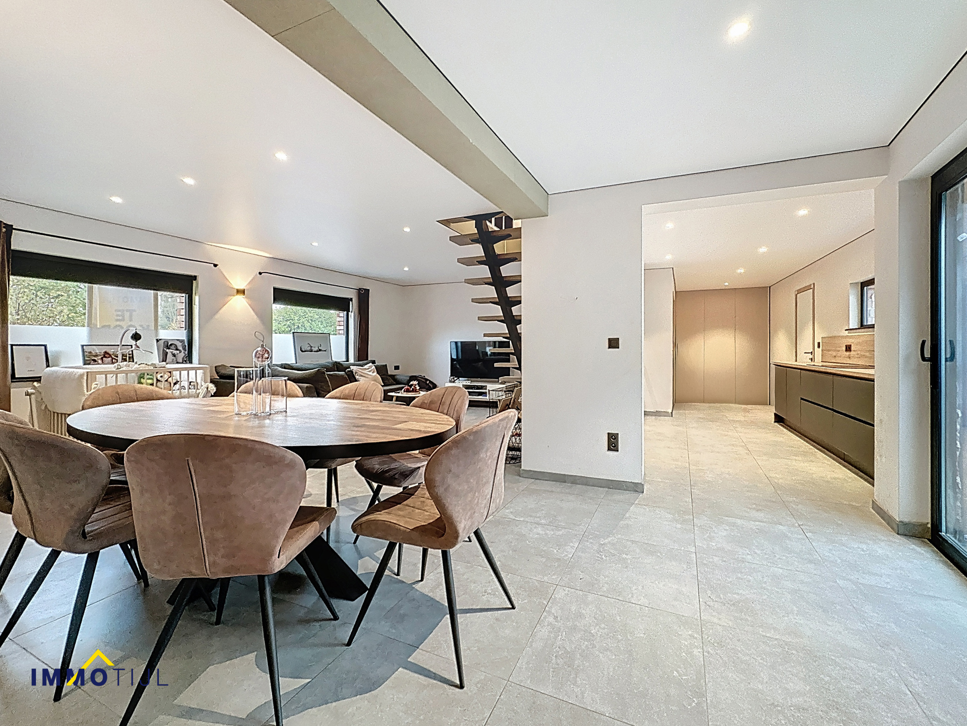 Deze recent gerenoveerde woning verwelkomt u op het gelijkvloers met een ruime inkomhal met gastentoilet en een lichtrijke woonkamer, waar een veelzijdige hoek werd gecreëerd die perfect dient als bureauruimte of speelhoek. De moderne keuken is volledig uitgerust met hoogwaardige SMEG-toestellen. Verder vindt u op deze verdieping een stijlvolle badkamer met inloopdouche en dubbele lavabo en een praktische berging/wasplaats.