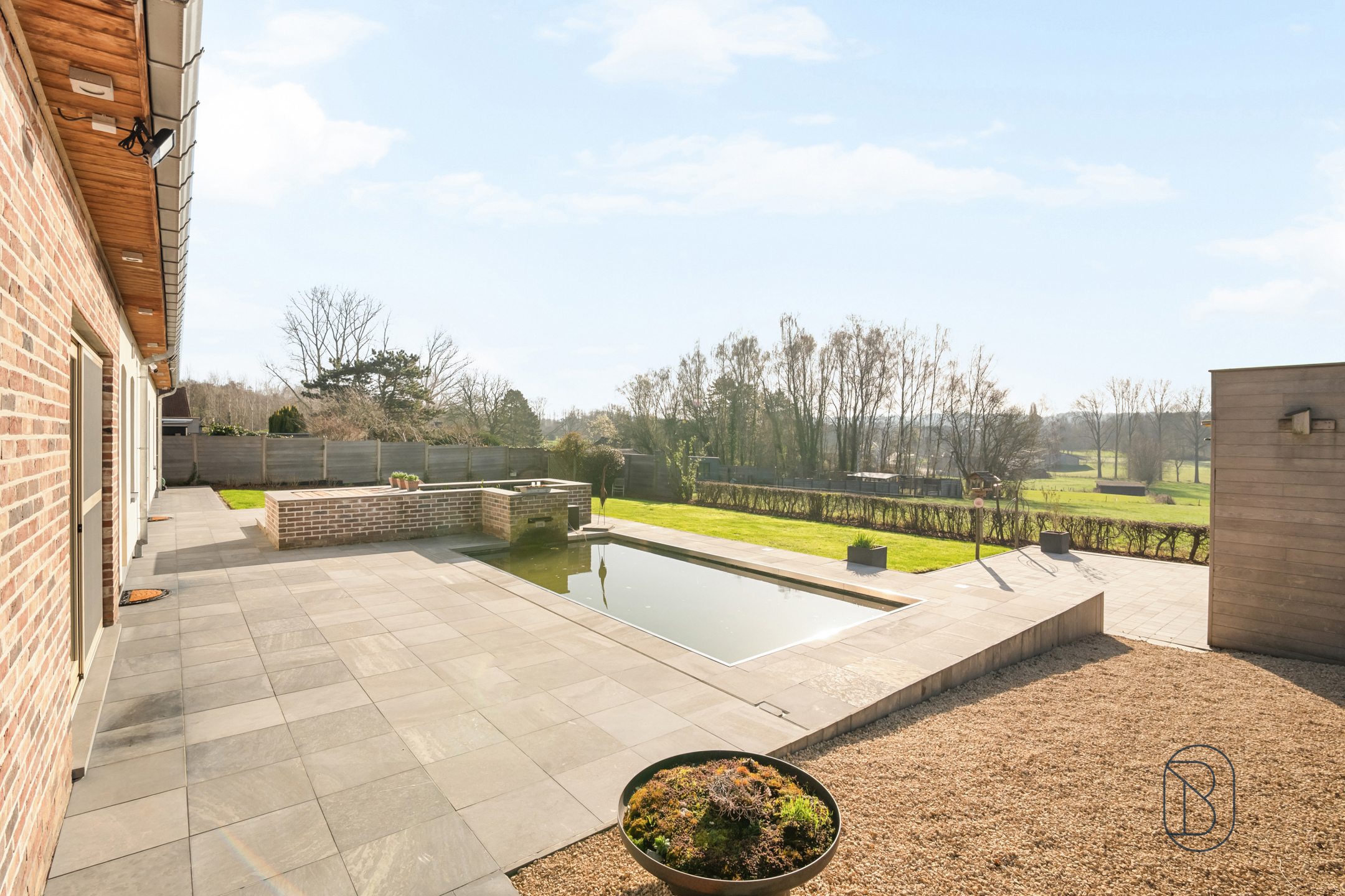 Volledig gerenoveerde landelijke woning, bestaande uit op het gelijkvloers, inkomhall, living-salon met open ingericht keuken, wasruimte, badkamer met douche en toillet, bureel met apparte ingang, op de verdieping drie ruime kamers, badkamer met bad en toillet, dressing, 2 aangelegde terrassen met (zwem)vijver, poolhous, tuin met ver zicht op aansluitende natuur. Deze woning is zeer lichtrijk dankzij de grote ramen en voorzien van alle comfort.