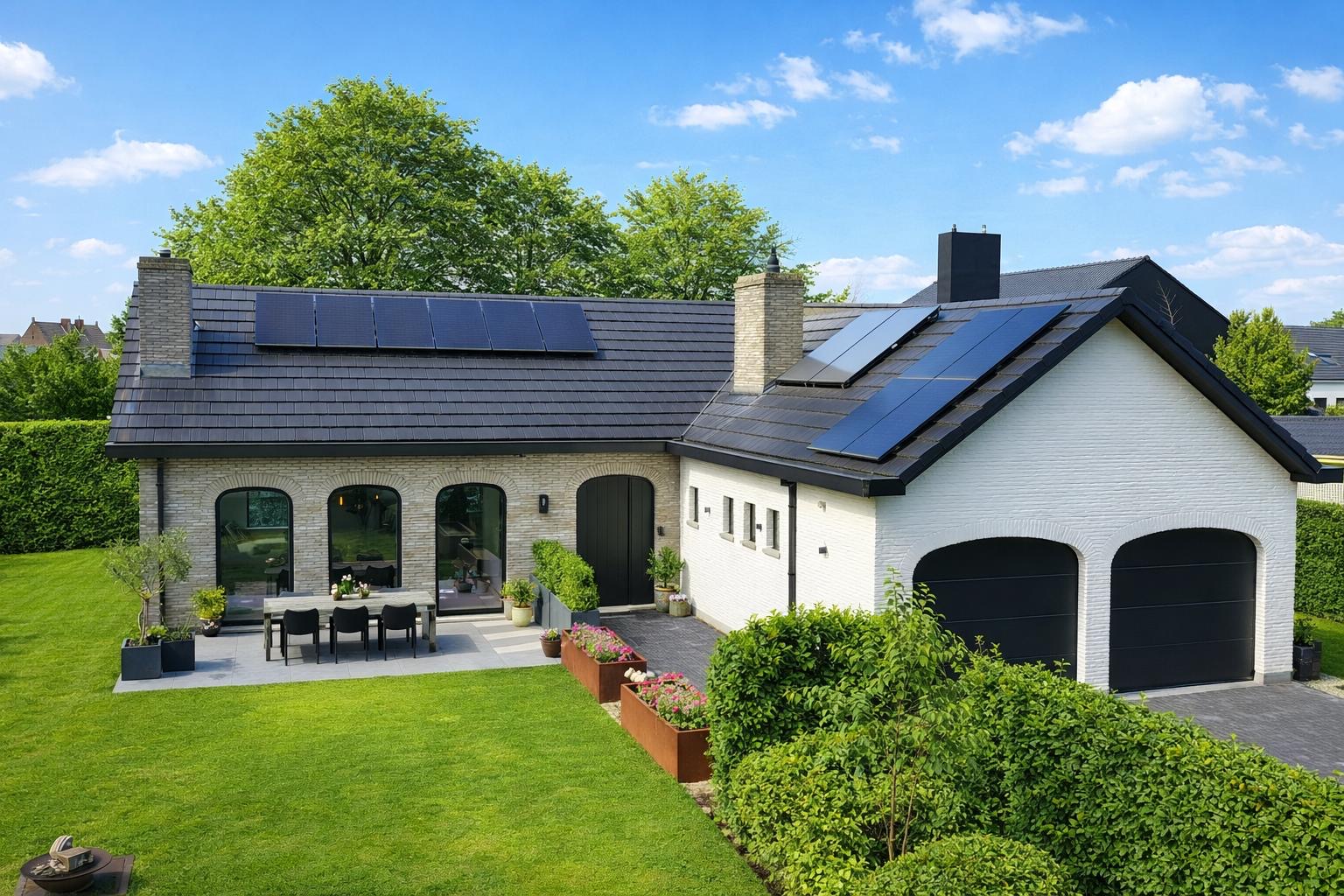 Het perceel wordt stijlvol afgesloten door een strak geautomatiseerd hek met videofonie, wat niet alleen elegant oogt maar ook zorgt voor extra comfort en veiligheid. De groene haag rondom het perceel garandeert maximale privacy en versterkt het gevoel van rust en geborgenheid.